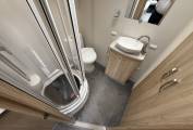 On entering via the Flyscreen protected Habitation Door, to your right, across the rear of the motorhome is the spacious bathroom where you will find a Thetford Flushing Cassette Toilet, a Wash Handbasin, a Shower Cubicle and large Wardrobe.