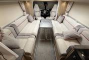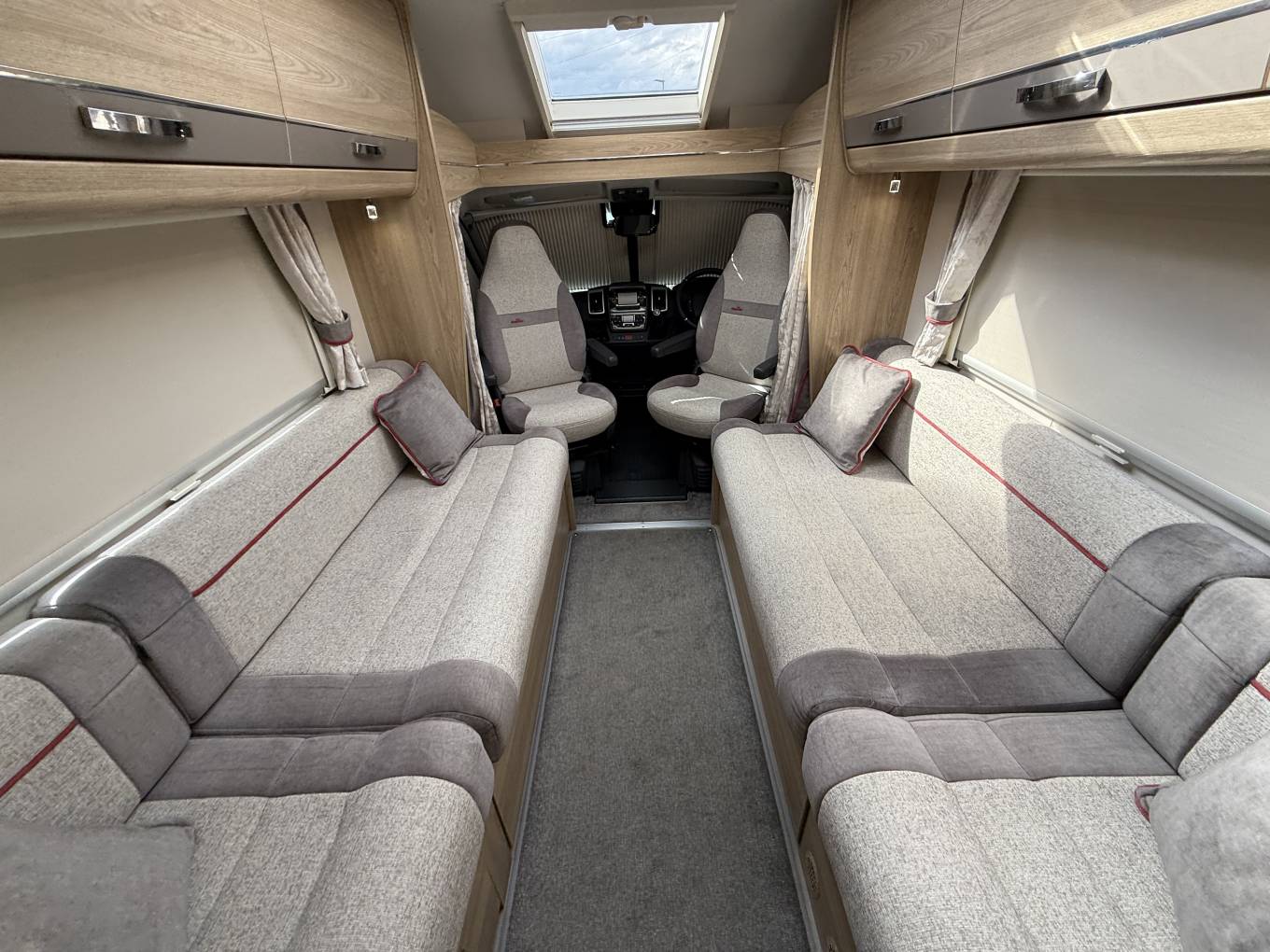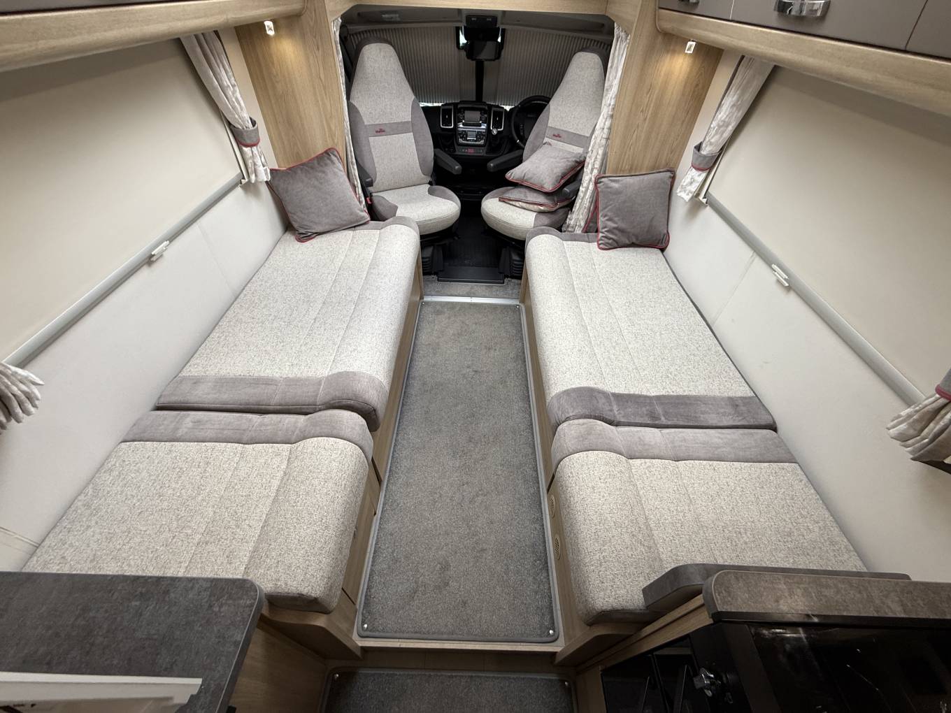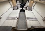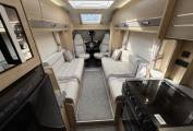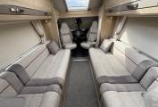 The main lounge consists of two long inward facing settees and twin swivelling Cab Chairs. A removable ding table sits in the centre.