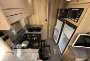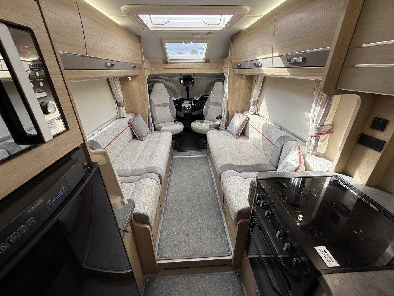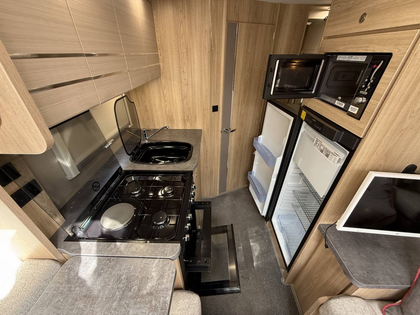 To your left, across the centre of the motorhome is the comprehensively equipped kitchen consisting of a Three Gas Burner and one Electric Hotplate Hob, a separate Oven and Grill, a large Dometic Fridge Freezer, a Microwave Oven, a Sink with a Hot and Cold Mixer Tap plus plenty of cupboards and drawers and an extendable worktop.