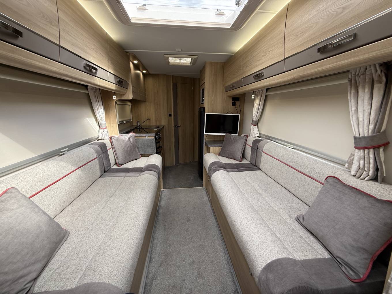 Outside, a Thule Awning, a Television Aerial, a Solar Panel, a Barbecue Gas Outlet, a Towbar and a Reversing Camera have all been fitted.