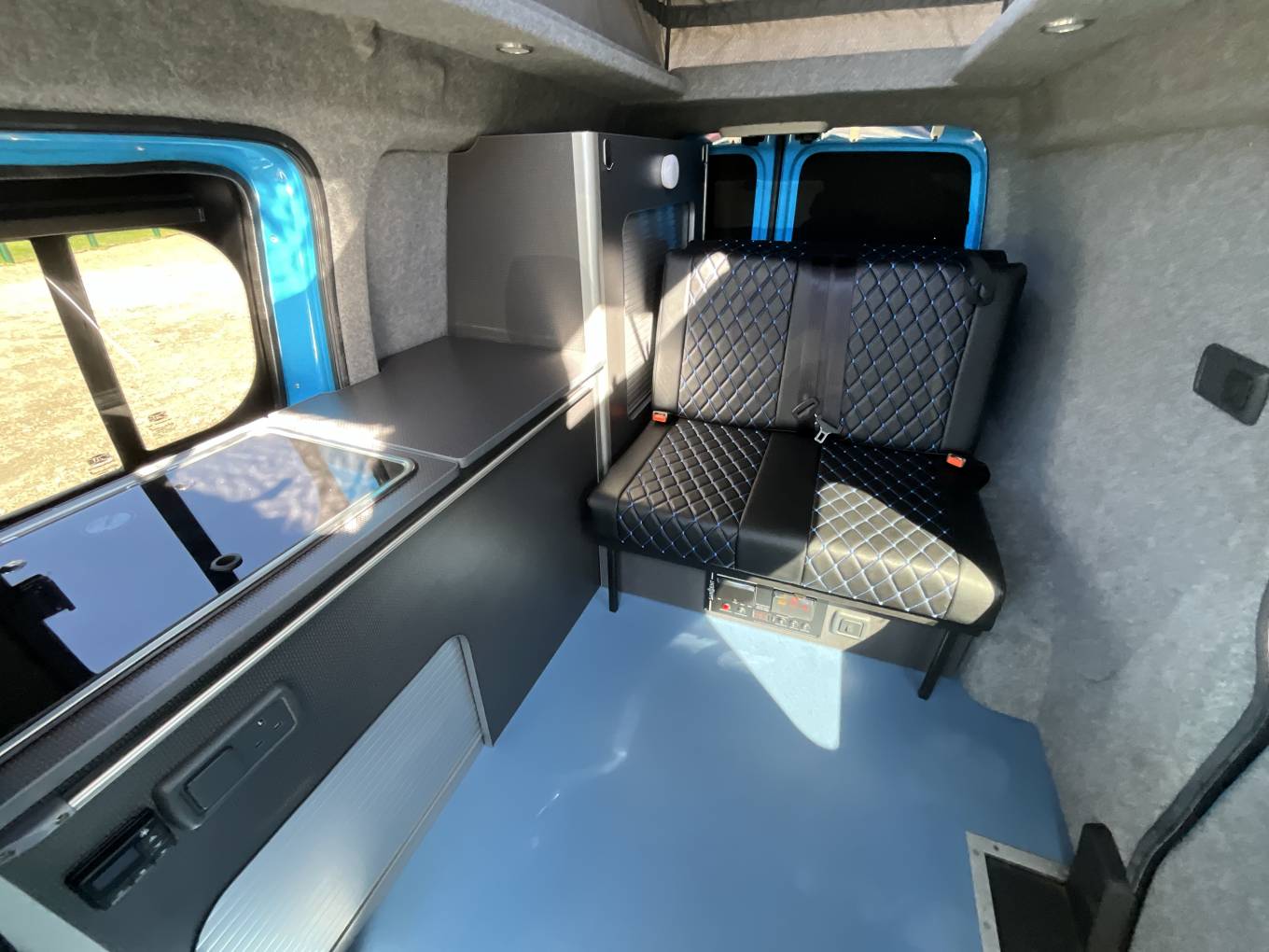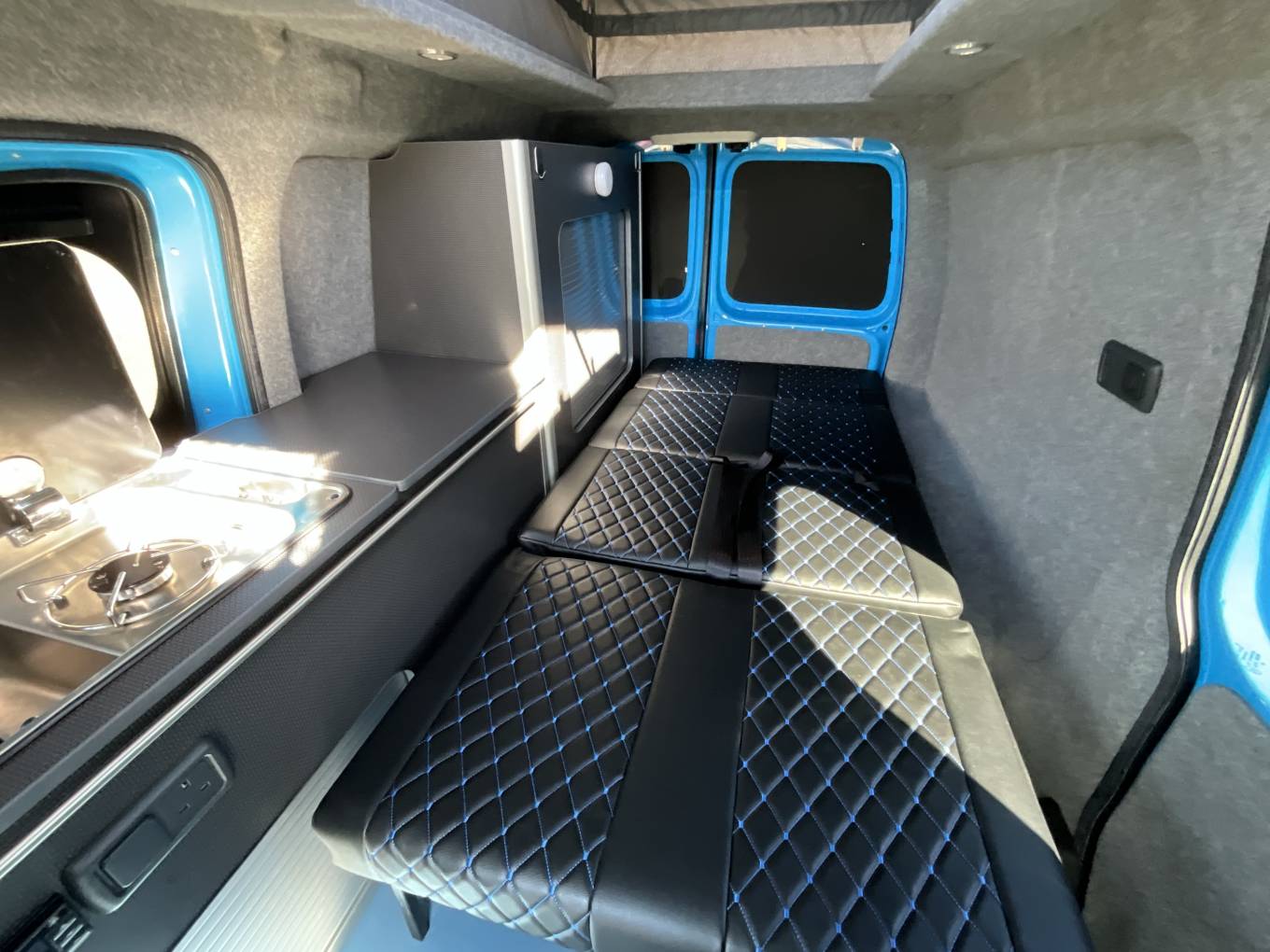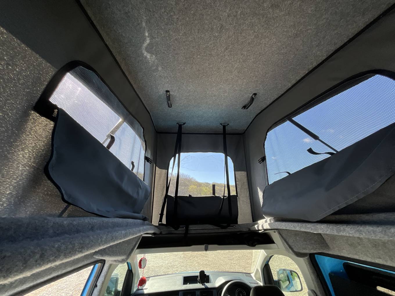 Converted by Rising Sun Campers, this pop top model is perfect for weekends away, extended road trips or used as an every day van as it fits in to a standard car park space. Starting at the front of this desirable campervan you have the central dinette which has a quality kitchen area with sink, 1 gas ring and chest fridge. As evening nears the rear travelling seats conveniently convert into a comfortable 3/4 rock ānā roll bed. The pop top provides plenty of head room allowing you to stand and walk around easily.