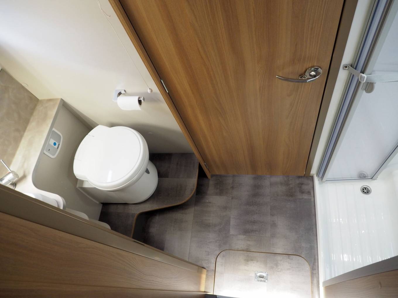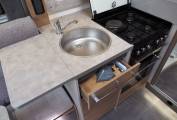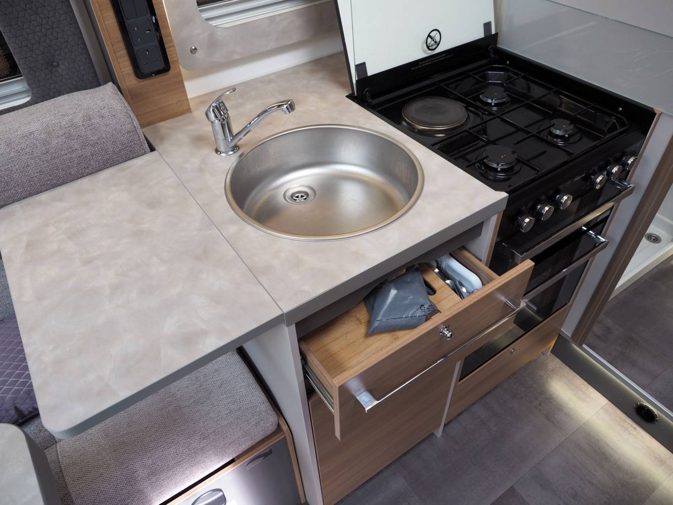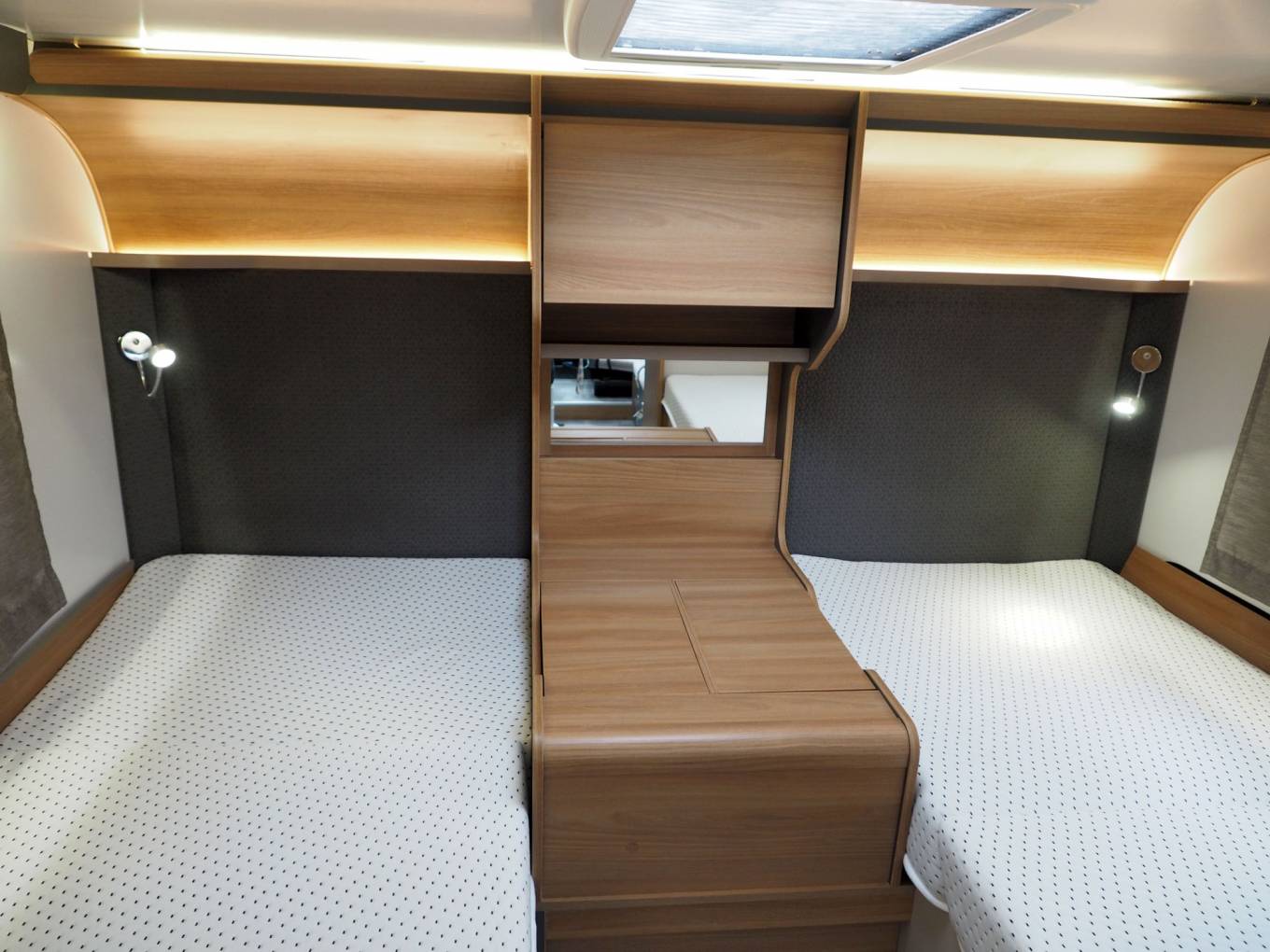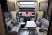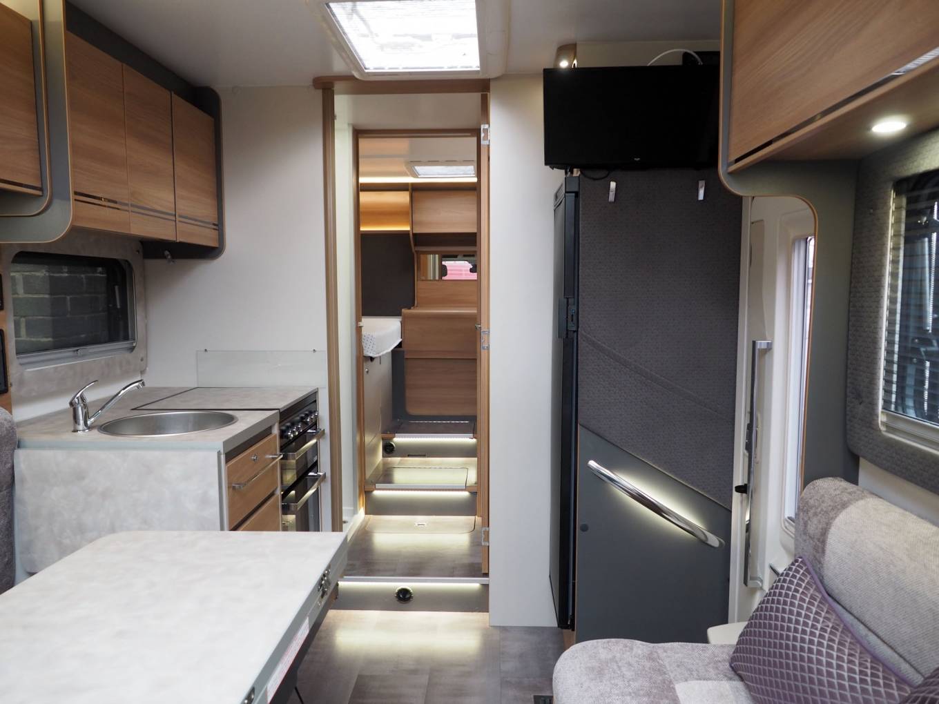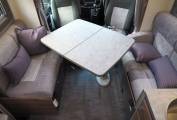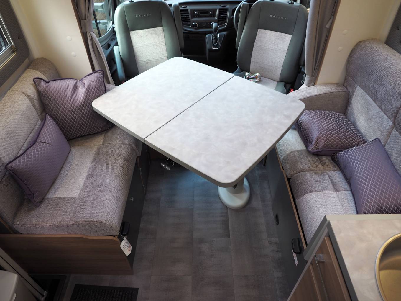 They layout comprises of a generous forward lounge with swivel cab seats and twin side settees, set around and electrically lowered, multiposition pedastal table. This area can be converted into a double bed and there are two pop up forward facing travelling seats, making 4 x 3 point seatbelts in total.
