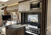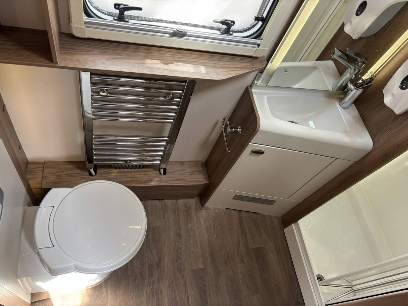 The layout comprises of a spacious front lounge which converts into a double bed. You will then find the kitchen located in the middle of the motorhome and is fitted with a Dometic Oven/Grill, Microwave, 4 ring burner hob, sink/mixer tap and plenty of storage cupboards. The transverse double bed is located at the rear of the vehicle and comes with a custom fitted mattress cover/protector and a TV mount. The real standout of this motorhome is the rear washroom/bathroom which is incredibly spacious and features a separate walk in shower cubicle. It is also fitted with a toilet, sink/mixer tap, soap dispenser, towel rail and vanity mirror.