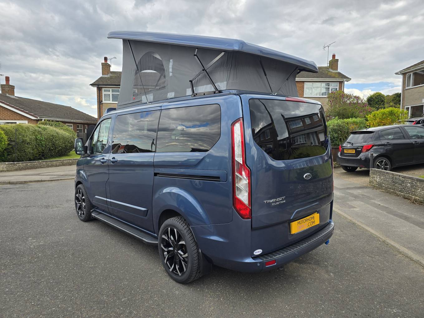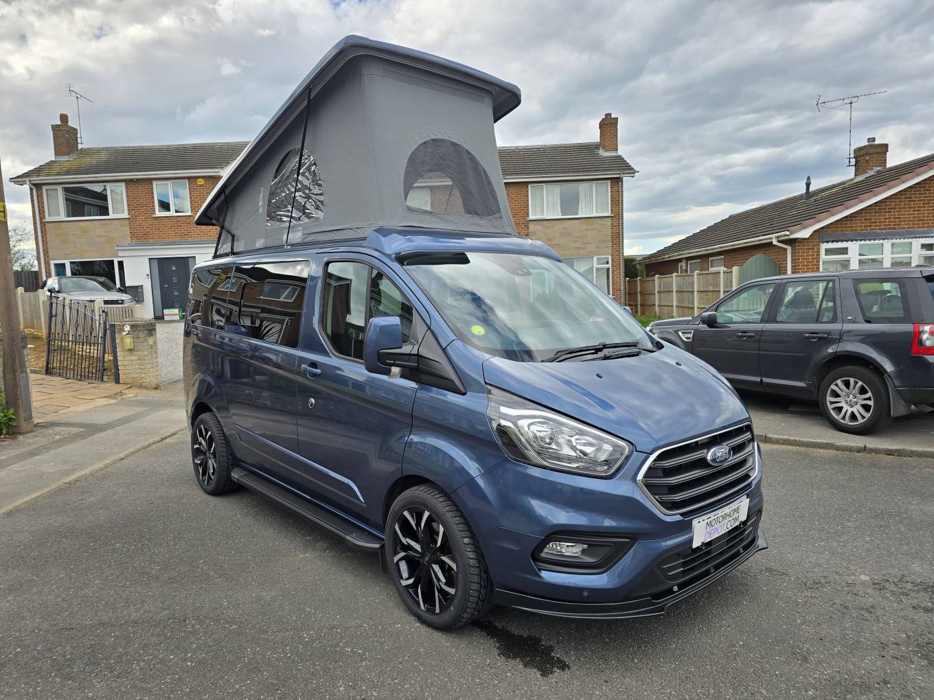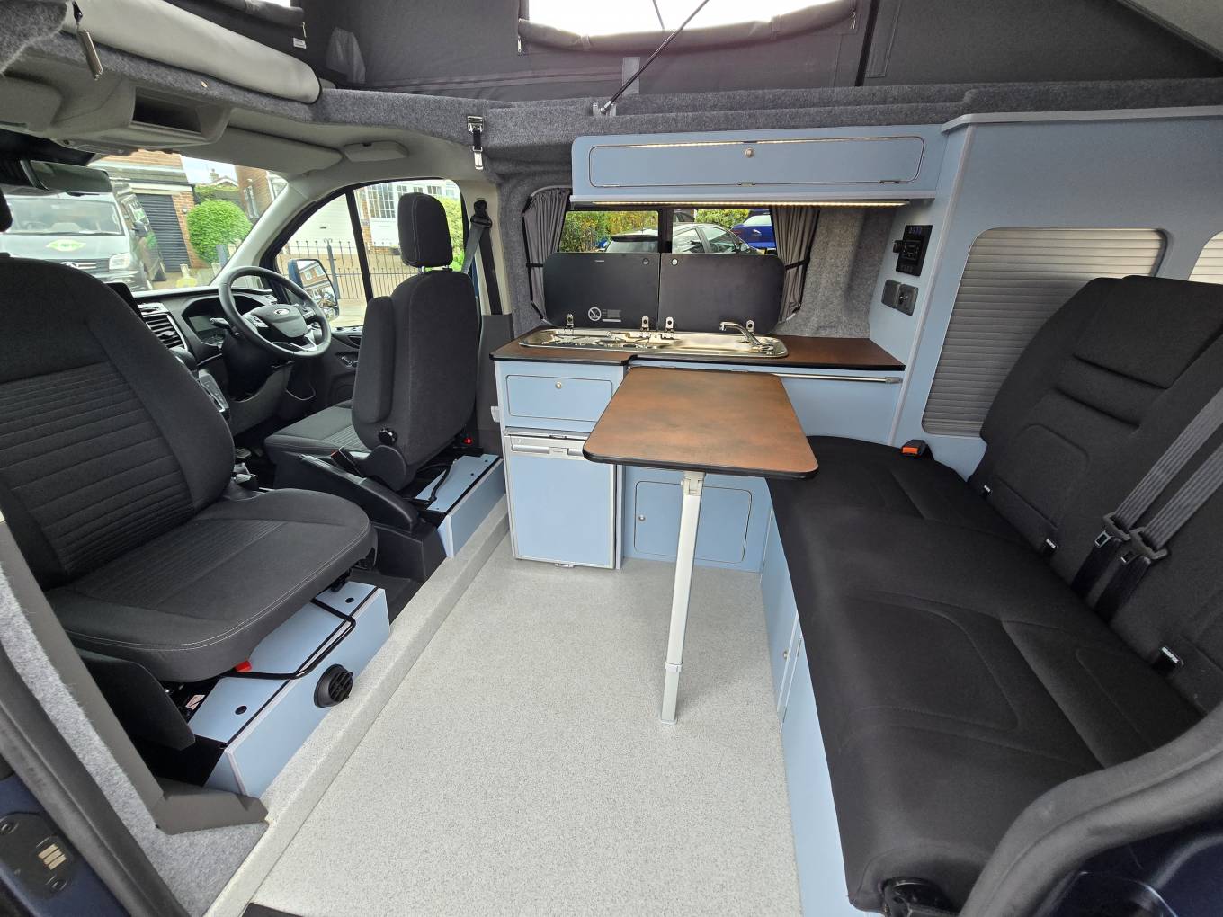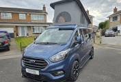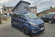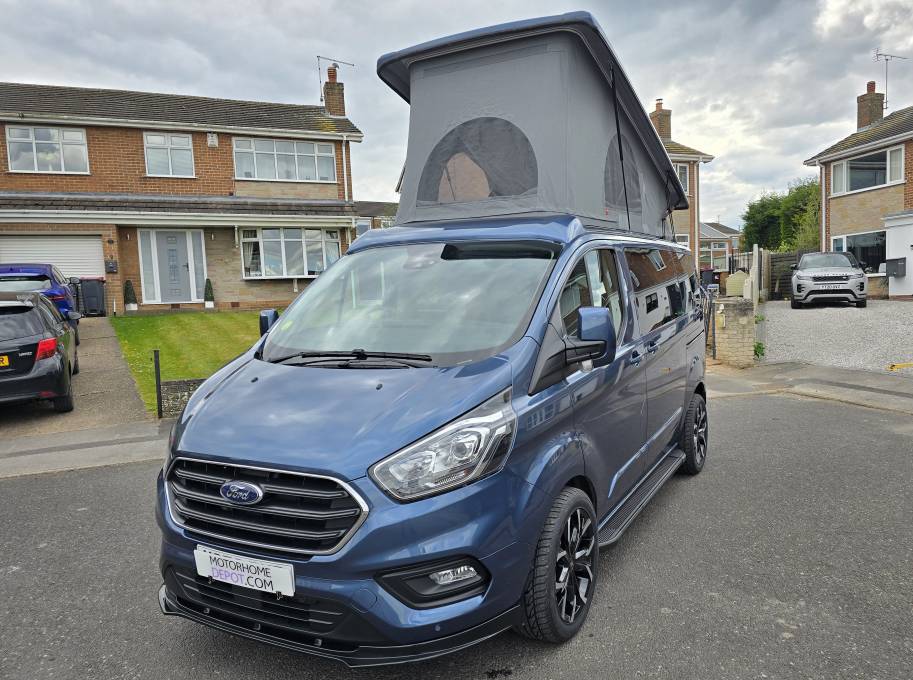 Motorhome Depot are pleased to present this beautiful 2023 Ford Transit Custom Limited with the desired Automatic gearbox. This was converted by the well-respected PF Jones of Stoke On Trent, who specialise in high quality bespoke conversions and the quality can be seen throughout this camper, from the top of the range SCA Panorama pop top with disk springs under the mattress, to the top of the range Rib Bed with ISO Fix to the Autoerm Diesel heater and many more features. Being built on a late 2023 Limited spec Transit Custom, it’s not only the conversion that is of high quality with great features, the vehicle itself also has great spec and features listed below. This camper is finished in a stunning blue with new 18” Alloys wheels, low mileage of under 7,500, and the first MOT not due till October 2026.