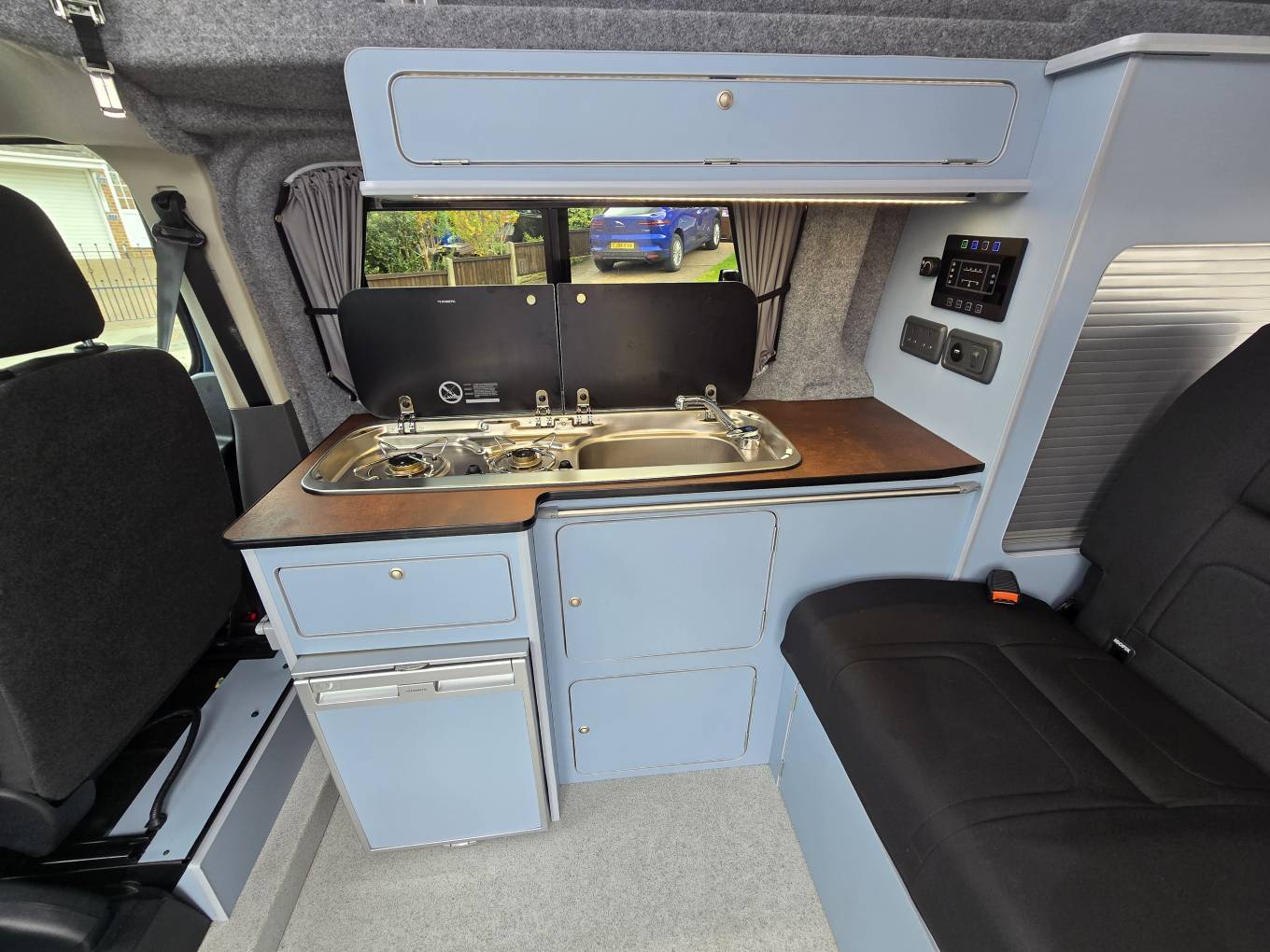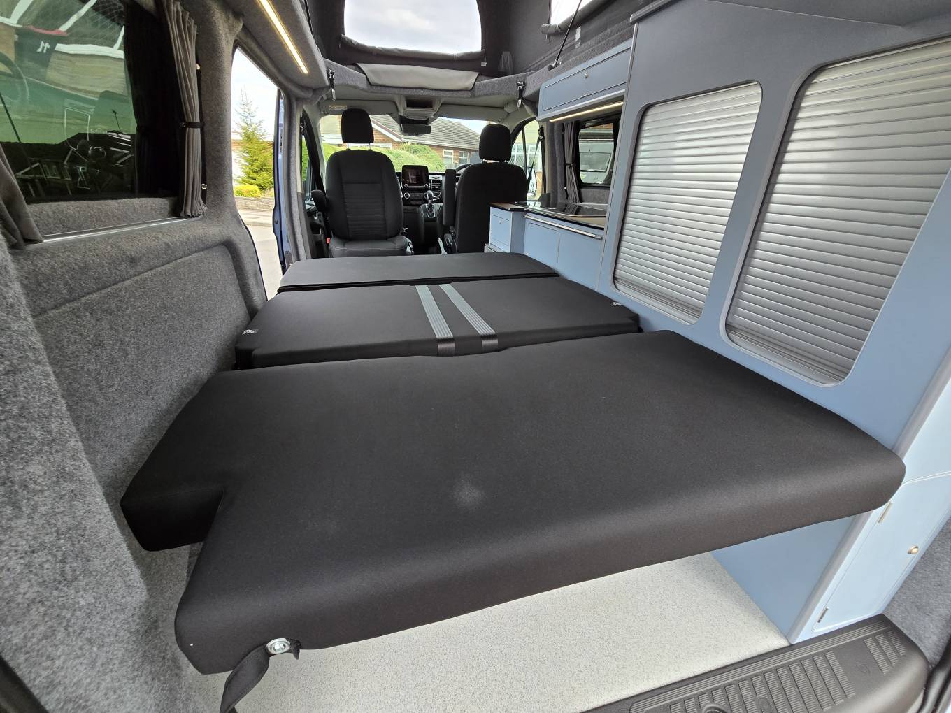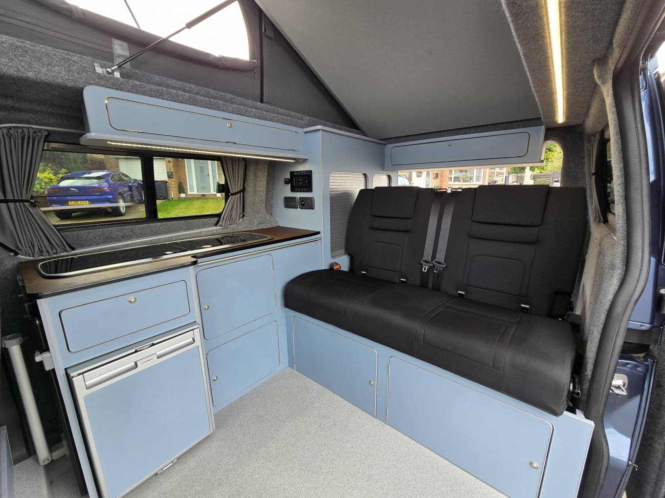 Motorhome Depot are pleased to present this beautiful 2023 Ford Transit Custom Limited with the desired Automatic gearbox. This was converted by the well-respected PF Jones of Stoke On Trent, who specialise in high quality bespoke conversions and the quality can be seen throughout this camper, from the top of the range SCA Panorama pop top with disk springs under the mattress, to the top of the range Rib Bed with ISO Fix to the Autoerm Diesel heater and many more features. Being built on a late 2023 Limited spec Transit Custom, it’s not only the conversion that is of high quality with great features, the vehicle itself also has great spec and features listed below. This camper is finished in a stunning blue with new 18” Alloys wheels, low mileage of under 7,500, and the first MOT not due till October 2026.