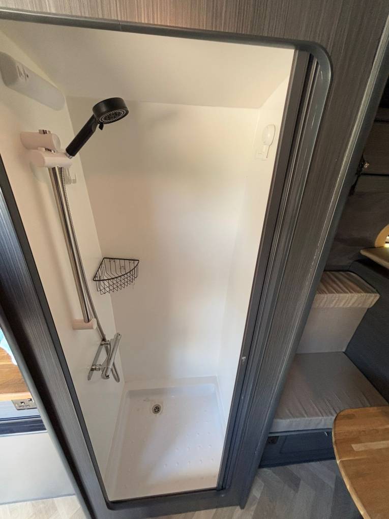 You have a spacious shower room and then have the kitchen space next to the habitation door which will allow you extra ventilation and comes with gas burner rings, oven and grill, fridge and plenty of prep space and storage.