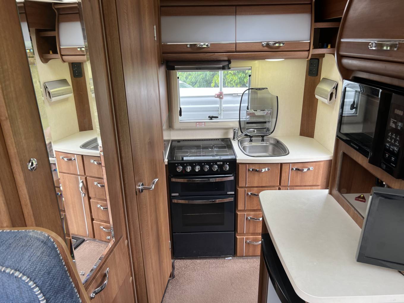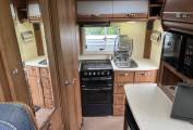 The kitchen at the rear, comprises a cooker, with oven, grill, 3 gas burners and electric hob, with sink next to it. The fridge is by the habitation door and there is good worktop space above plus microwave.