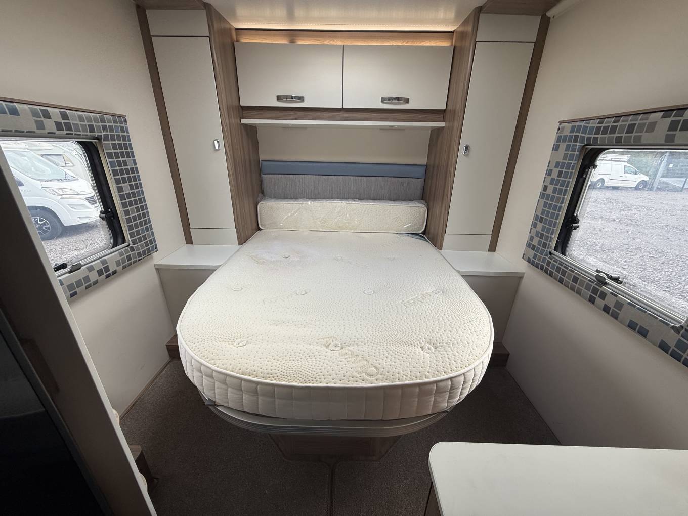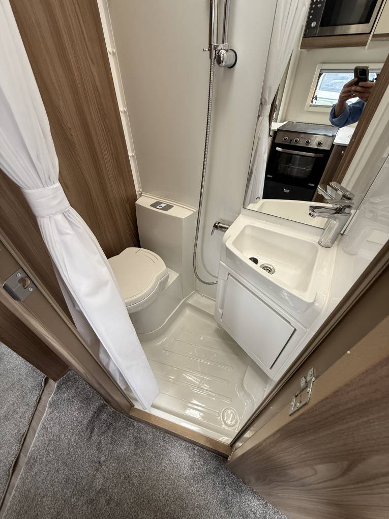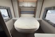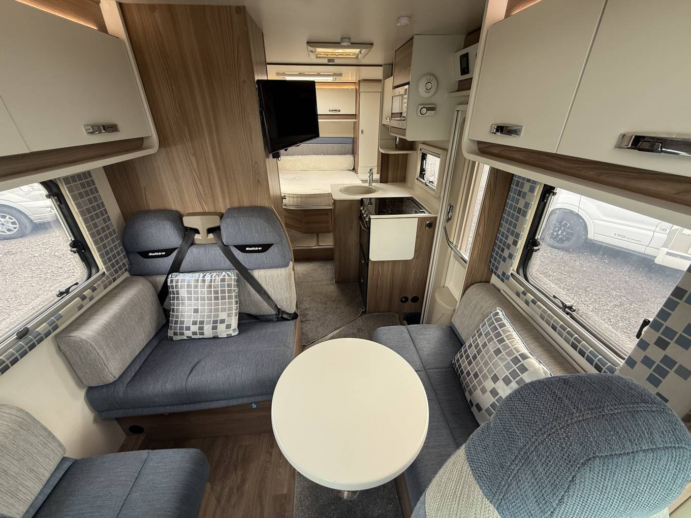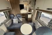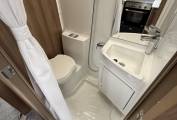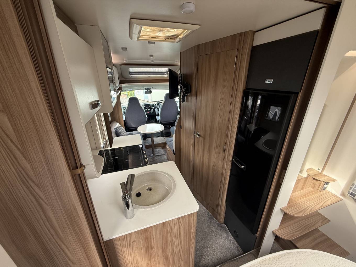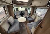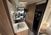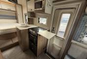 The layout of the Swift Escape 694 is from the front of the motorhome you have a spacious lounge area that makes use of the two Captain’s Chairs, one side facing sofa and a further L-shaped sofa. There is also a central round table that can be put up whenever you want to enjoy a meal or snack. As you move back the motorhome also has a very well equipped central kitchen which includes an oven, grill, microwave ,3 gas hob, sink and large tower fridge with freezer compartment, across from the kitchen area is the impressive and modern wet room style washroom that has a Thetford flush cassette toilet, sink and shower and at its rear is the impressive bedroom with island bed with wardrobes and lockers around, the bed can be lifted easily as its on hydraulic struts for more storage underneath.