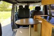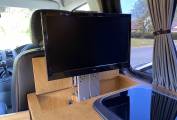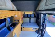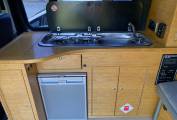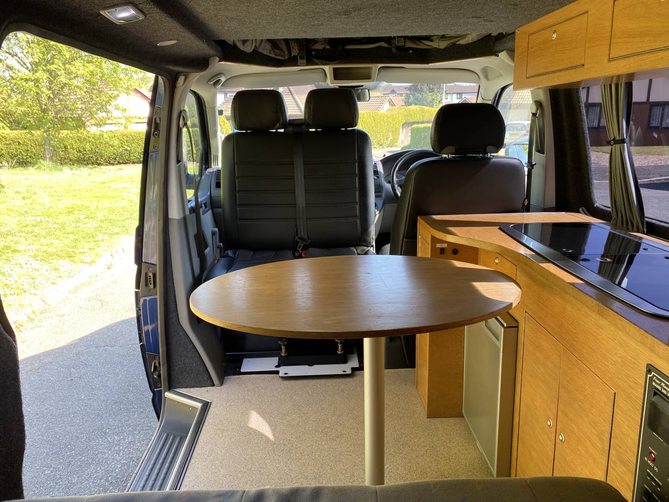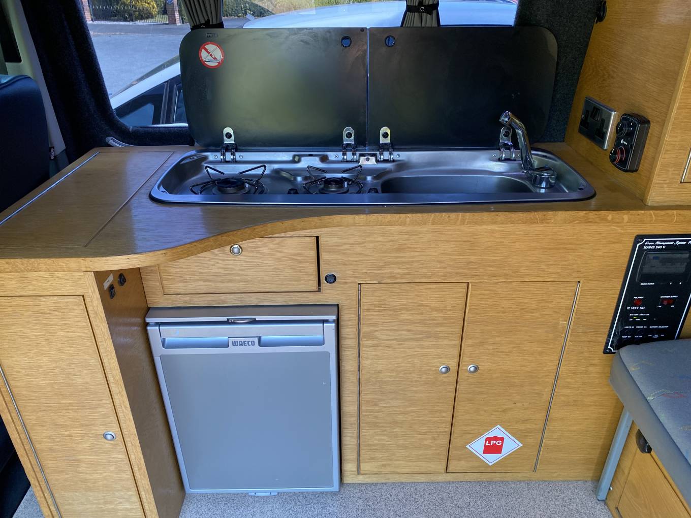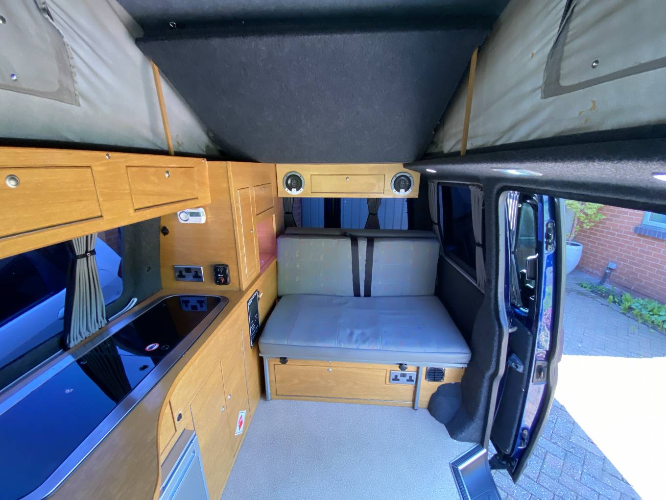 There are the standard conversion features such as rock’n roll bed, pop-top roof housing a double bed, sink, 2 burner gas hob, double seater swivelling passenger seat, 2 gas bottles, fridge/freezer, thermal screen cover, good cupboard space, free standing table and an extrea Duvalay mattress.