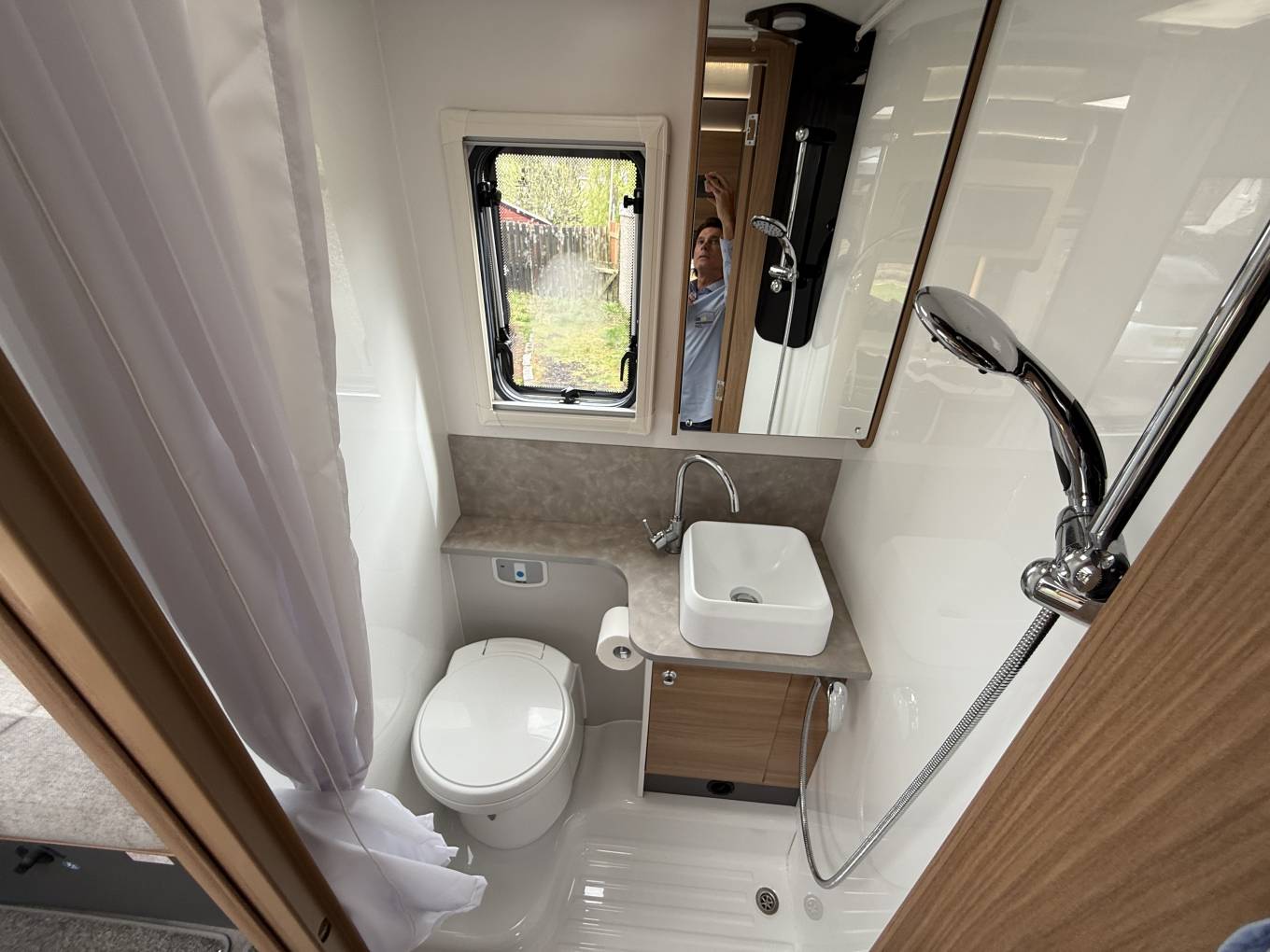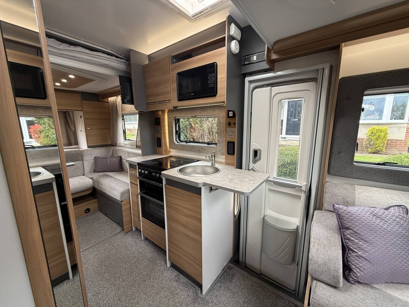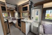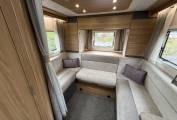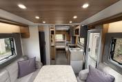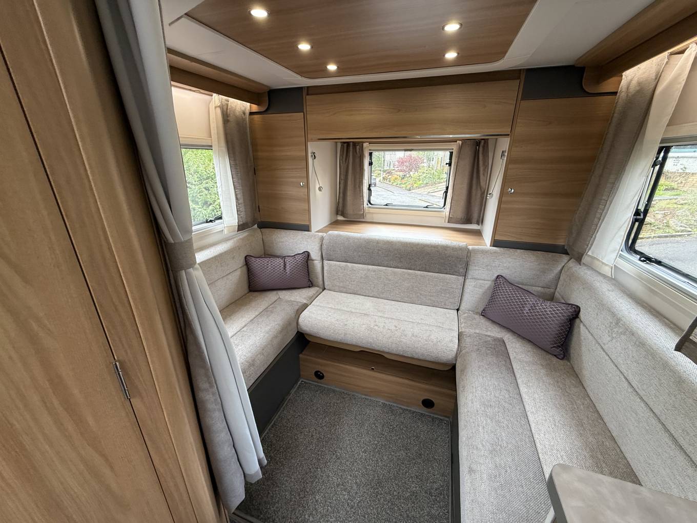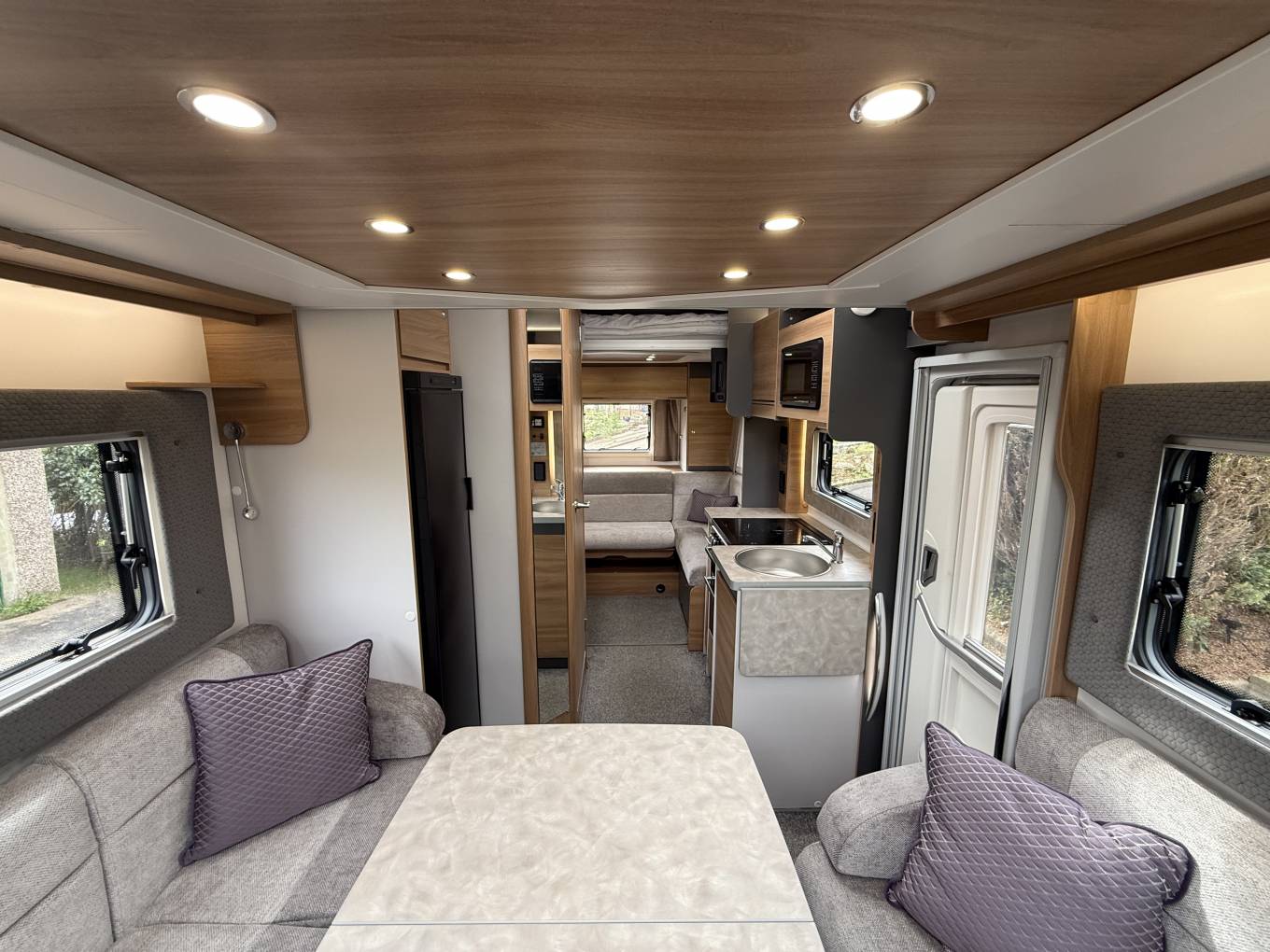 At the rear is a U-shaped lounge which also can be made up into a large double bed and has a wardrobe in each rear corner, one of which can be accessed from the outside. There is an Avtex Smart TV tucked away which can be viewed in this area. Over each lounge area is a double drop-down bed so there is room to sleep 8 in total.