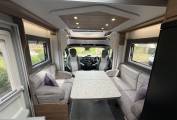 The layout of this impressive motorhome is on entering the habitation door on the nearside there is a dining area/lounge to the left with 2 swivel seats, a dining table and 2 forward facing passenger seats concealed below the opposing settees which can be made up into a double bed. The cab has a large roof vent above and there are integral cab blinds to the windows. Opposite the door is a large fridge with a freezer box and drawer within its base. Next comes a smart modern bathroom with toilet, washbasin and shower. You then have the well-appointed kitchen which has a full oven and grill, hob with 3 gas burners and an electric plate and a sink with an extra flap to form more workspace.