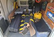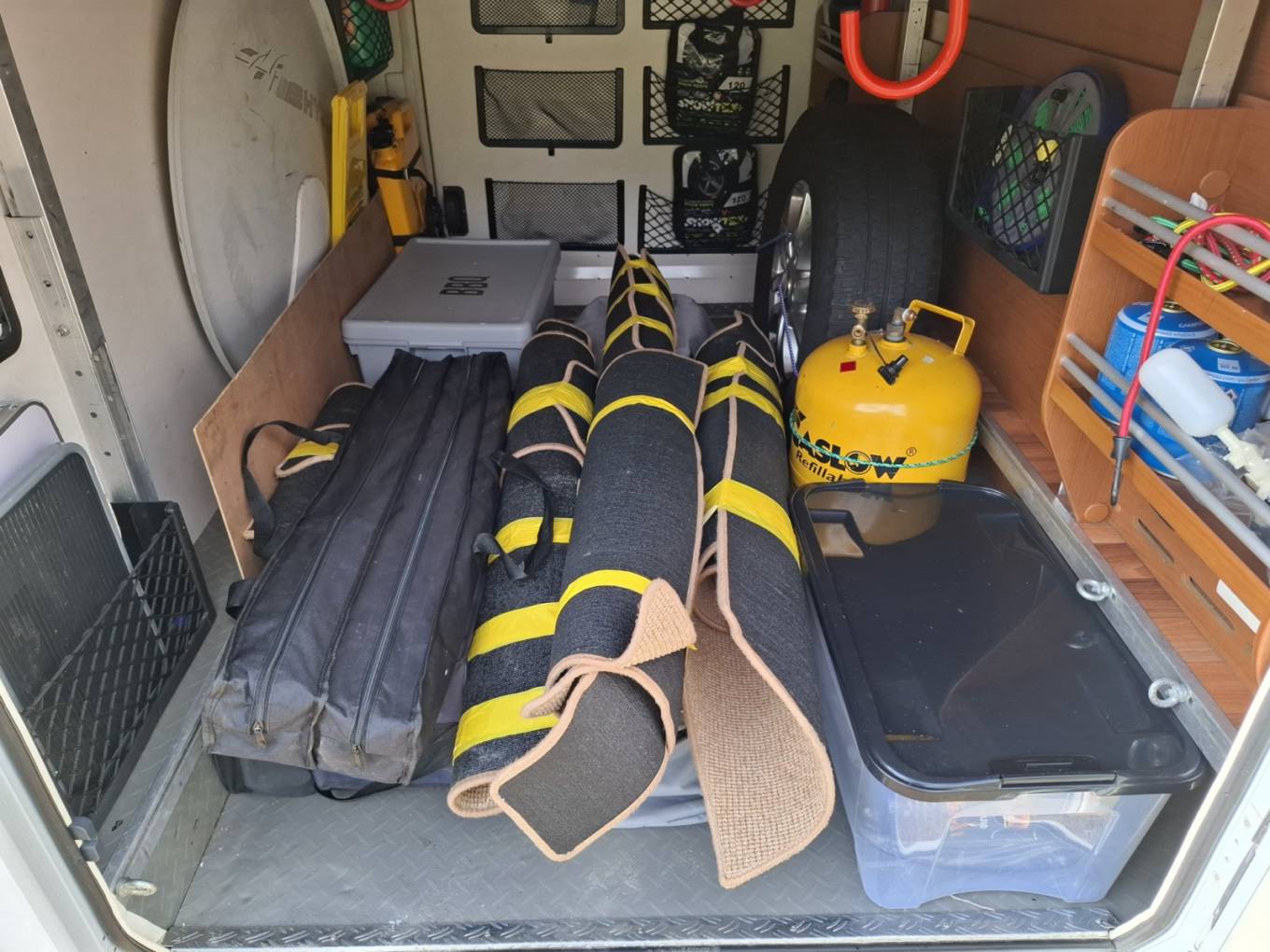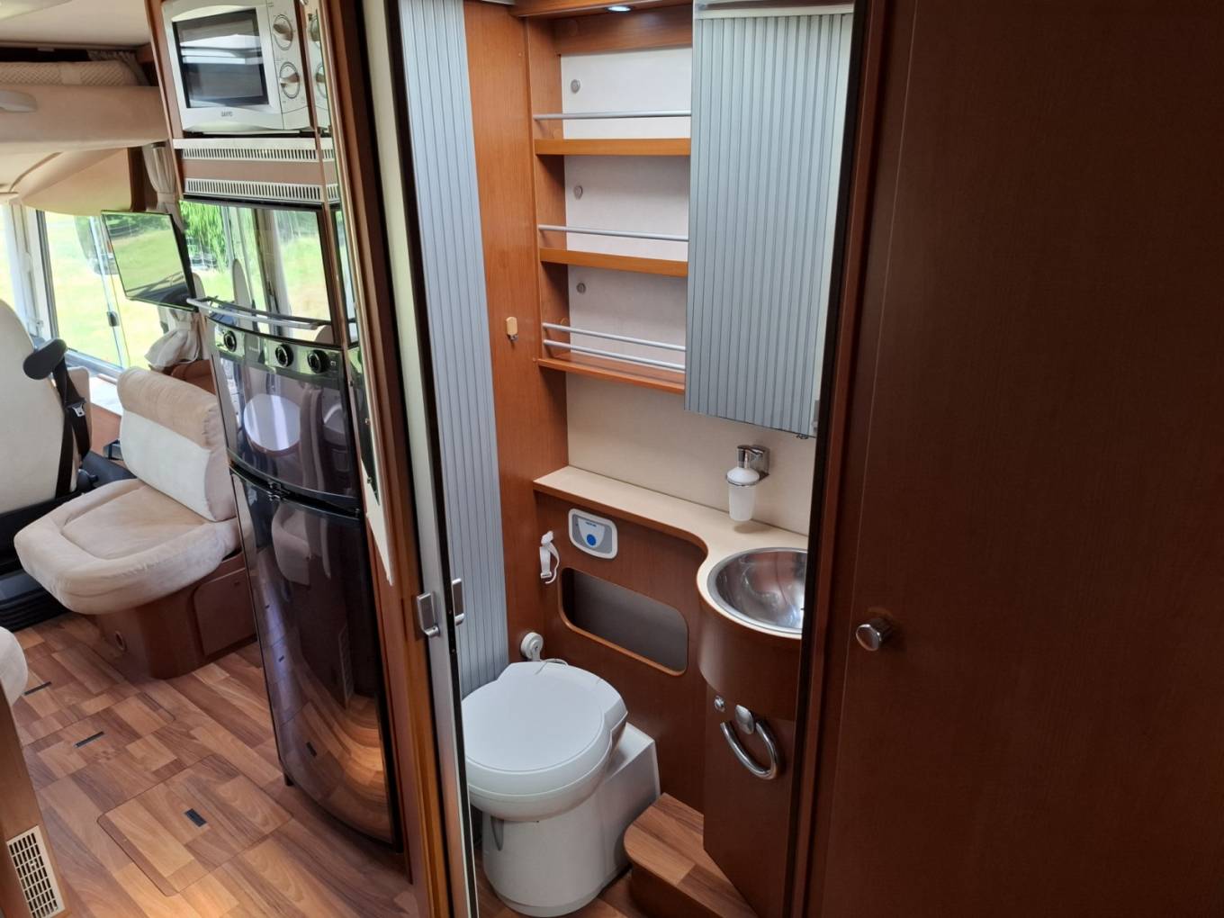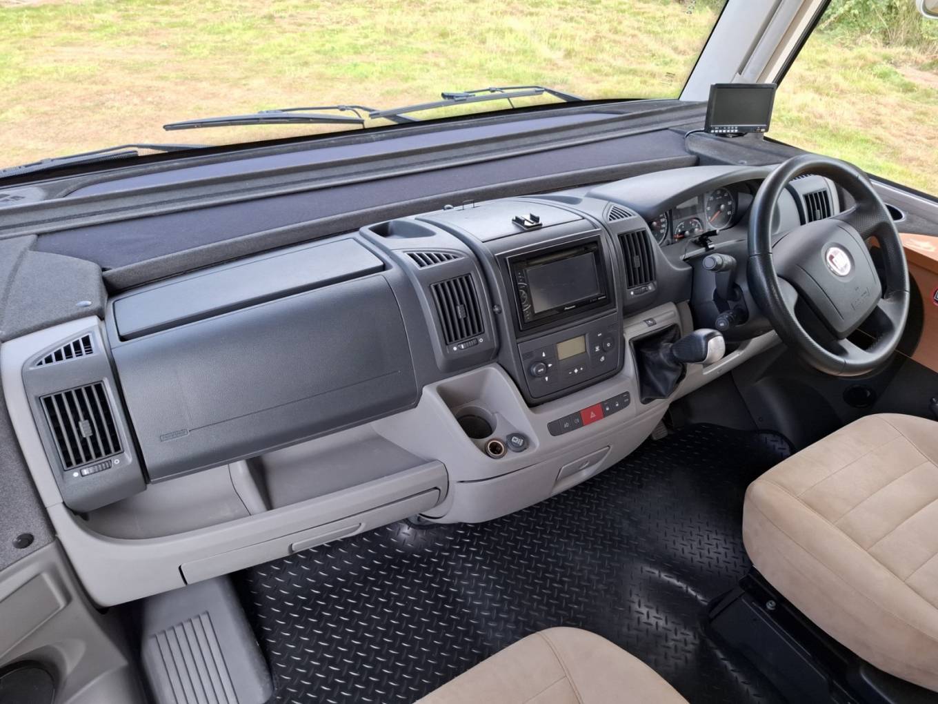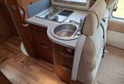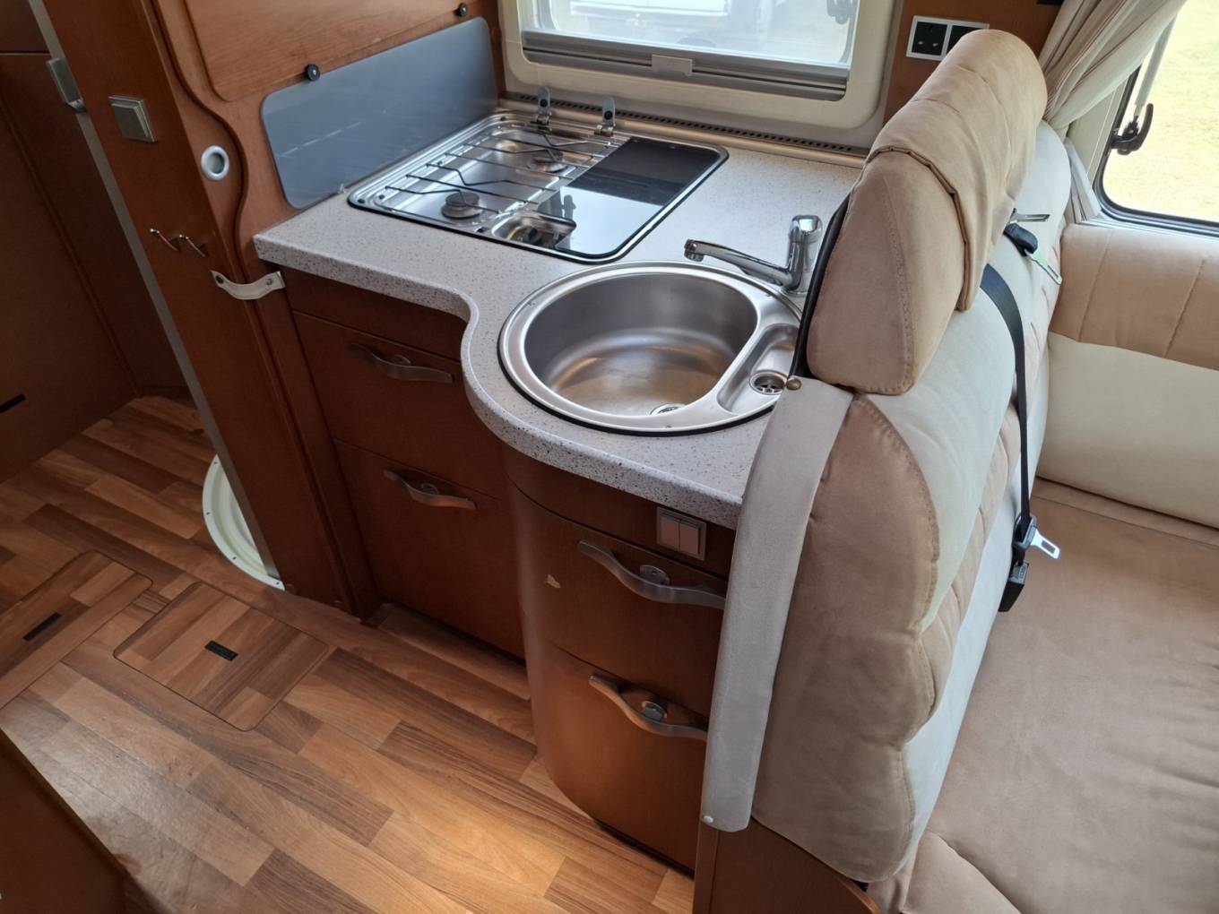 Conveniently adjacent, is the nearside side central kitchen, which features a hob with 3 gas burners, and a sink.Opposite, next to the habitation door, there is a microwave, a combination oven/grill, and a fridge with a separate freezer.