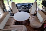 The forward habitation comprises L-shaped seating (with two additional forward facing seat belts) and an opposing side seat around a large circular table, which can be enhanced as a living/dining area by use of the swivel cab seats.