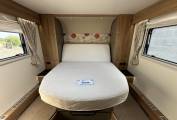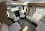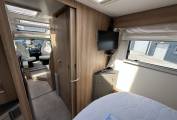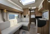 As you step into the habitation area, the lounge/dining area has an L-shaped sofa and a single seat opposite. With the two Captain’s chairs swivelled into the area, there is plenty of room for six to dine in comfort. There is also a TV in the lounge area. In the centre of the motorhome, you have the very well-appointed kitchen area complete with 3-burner gas hob with one electric plate, oven/grill, stainless steel sink with mixer tap, large 3-way fridge/freezer and a microwave. There is good work-top space for prep work and plenty of storage in the drawers and a large cupboard above. On the opposite side you have the washroom complete with separate shower unit with bi-fold door, Thetford cassette toilet with electric flush, washbasin with mixer tap and a storage cupboard. The bedroom with sliding privacy door at the rear is a lovely space with a large double island bed with easy access on both sides, large underbed drawers, a wardrobe either side of the bed and a couple of lockers. The dual fuel programmable Alde system provides heating to the radiators and hot water and there are removeable carpets fitted throughout, flyscreens and blinds on all windows and a sliding flyscreen on the habitation door.