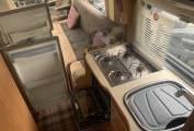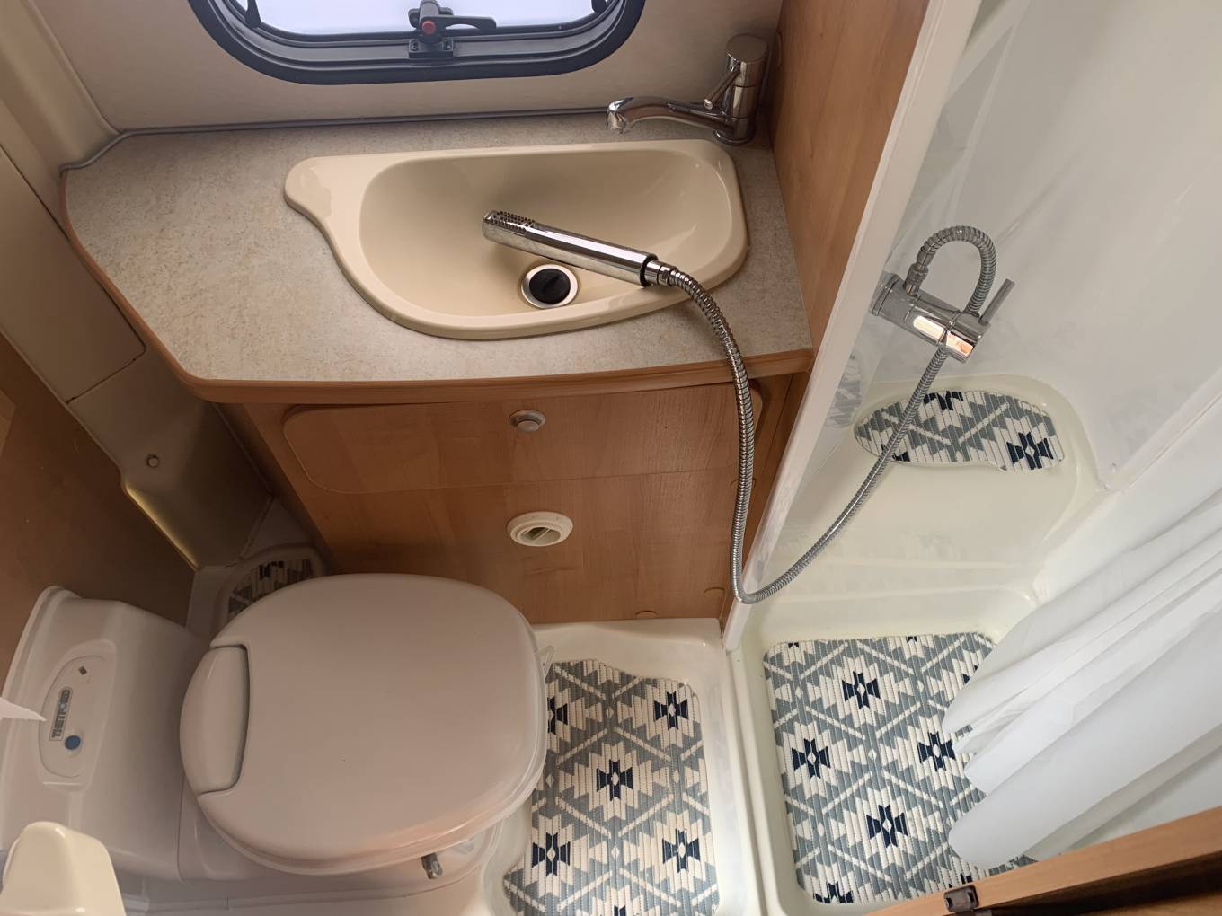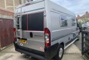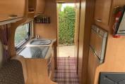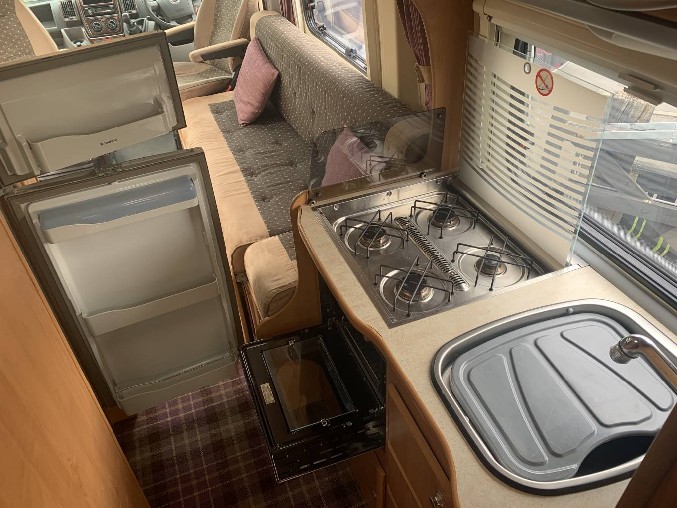 Being 6 metres long, it fits in most parking spaces. The rear washroom, comes with a toilet, sink and shower cubicle with curtain surround. Opposite is the kitchen with sink, extra capacity tall 3-way fridge with freezer compartment, then a cooker with oven, grill and 3 gas burners. There is a large wardrobe, storage area at the rear of the campervan.