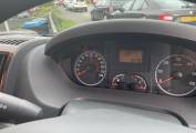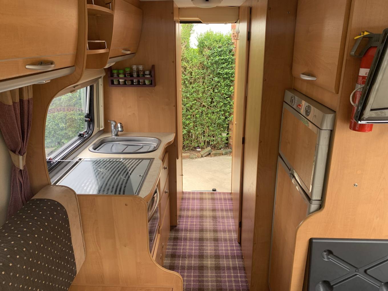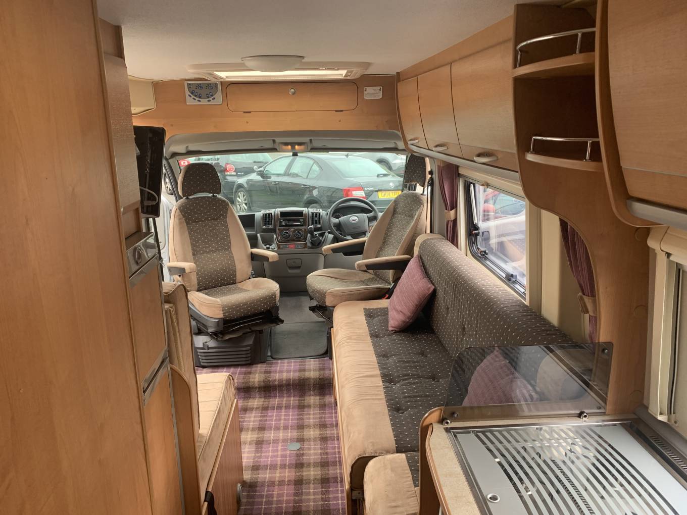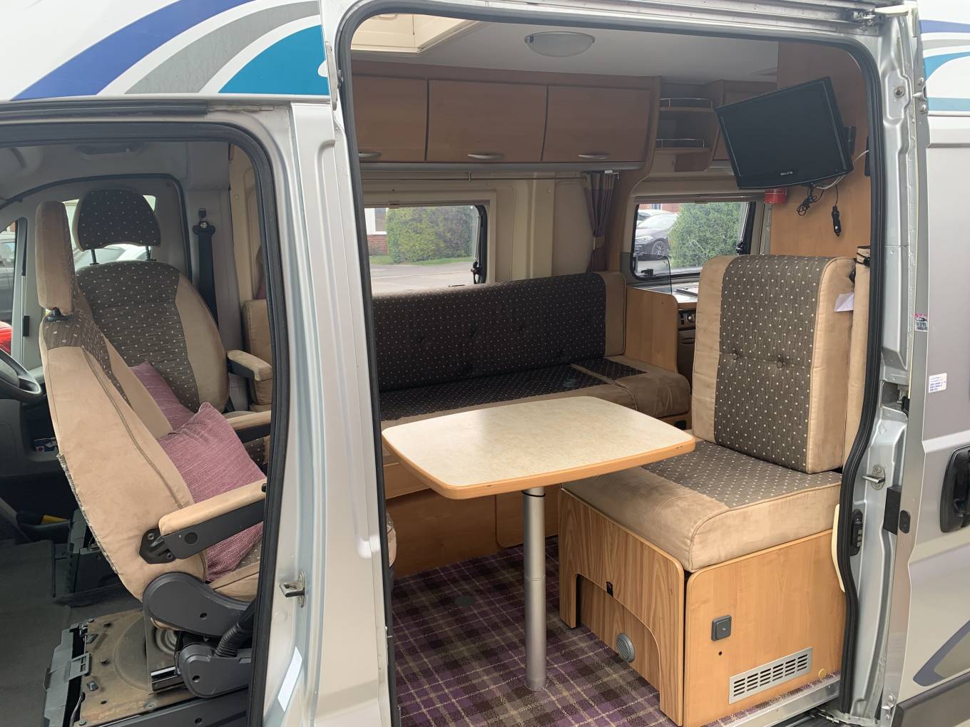 The layout comprises, rear washroom and galley style kitchen, then long sofa on the offside and 3rd travelling seat next to the sliding door, with 2 swivel seats in the cab