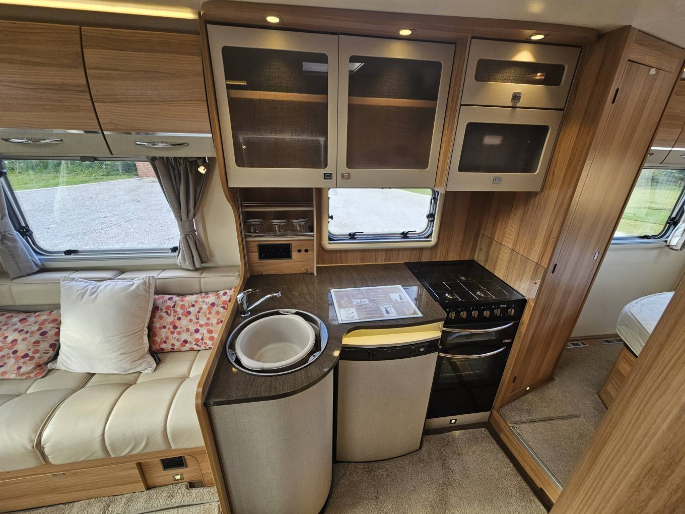 The cab features air con, cruise control, Bluetooth radio, reversing camera, and twin captain’s swivel seats. These integrate with the central dinette to create a large double bed (approx. 2.23m x 1.21m), while overhead lockers and LED lighting add style and function. The kitchen includes a 3 gas/1 electric hob, oven grill, microwave, sink with mixer tap, fridge with freezer, great workspace, and ample storage.