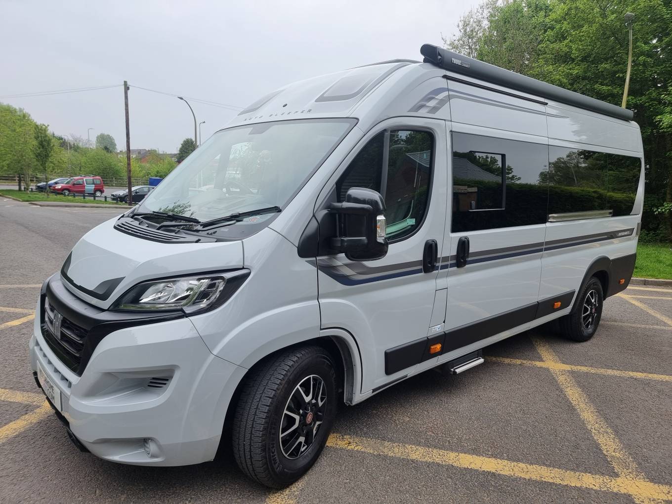 Motorhome depot St Helens are pleased to offer this 2023 Auto-Sleeper Kingham which is a premium 2-berth campervan renowned for its blend of comfort, practicality, and compact design. Built on the Fiat Ducato chassis, it offers a fixed French double bed that can be lifted for access to substantial under-bed storage, a fully equipped kitchen, and a combined shower and toilet compartment. The interior features high-quality finishes, including luxurious fabrics and a memory foam mattress