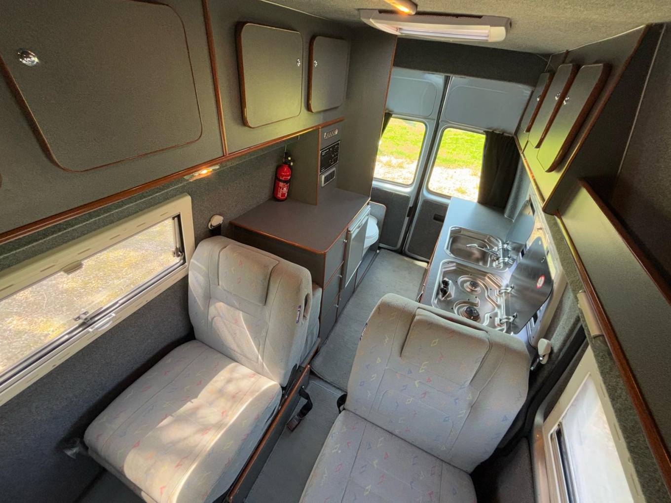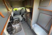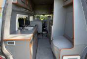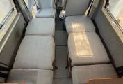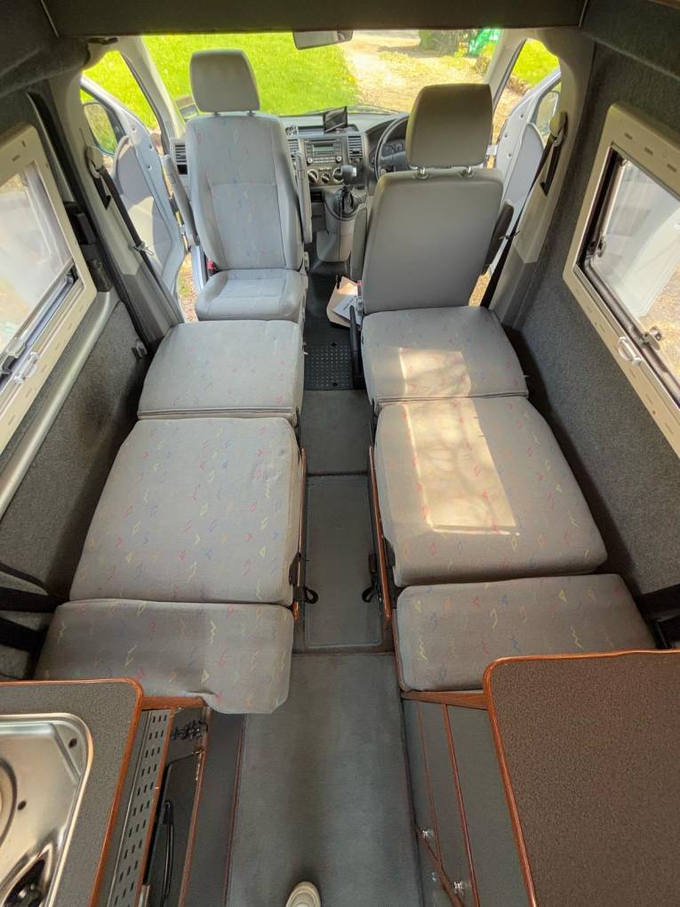 Layout - Starting at the front, you have two forward facing seats that house 2 additional seat belts. These seats then transform into two large singles simply by pulling the handles either side and swivelling the driver and passenger seats around to face the back of the camper. Just behind the seats we have the kitchen area this is made up with a 12v Fridge, Prep Area, Overhead Storage, 2x Gas Burner, with a Sink and Grill.