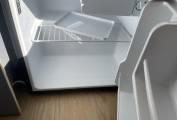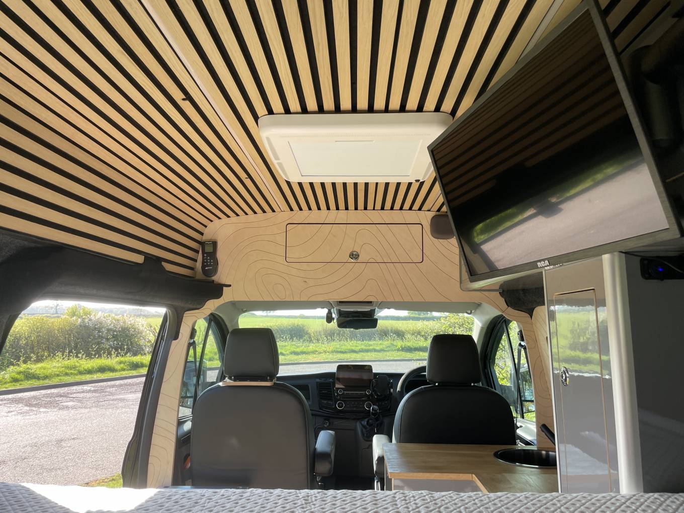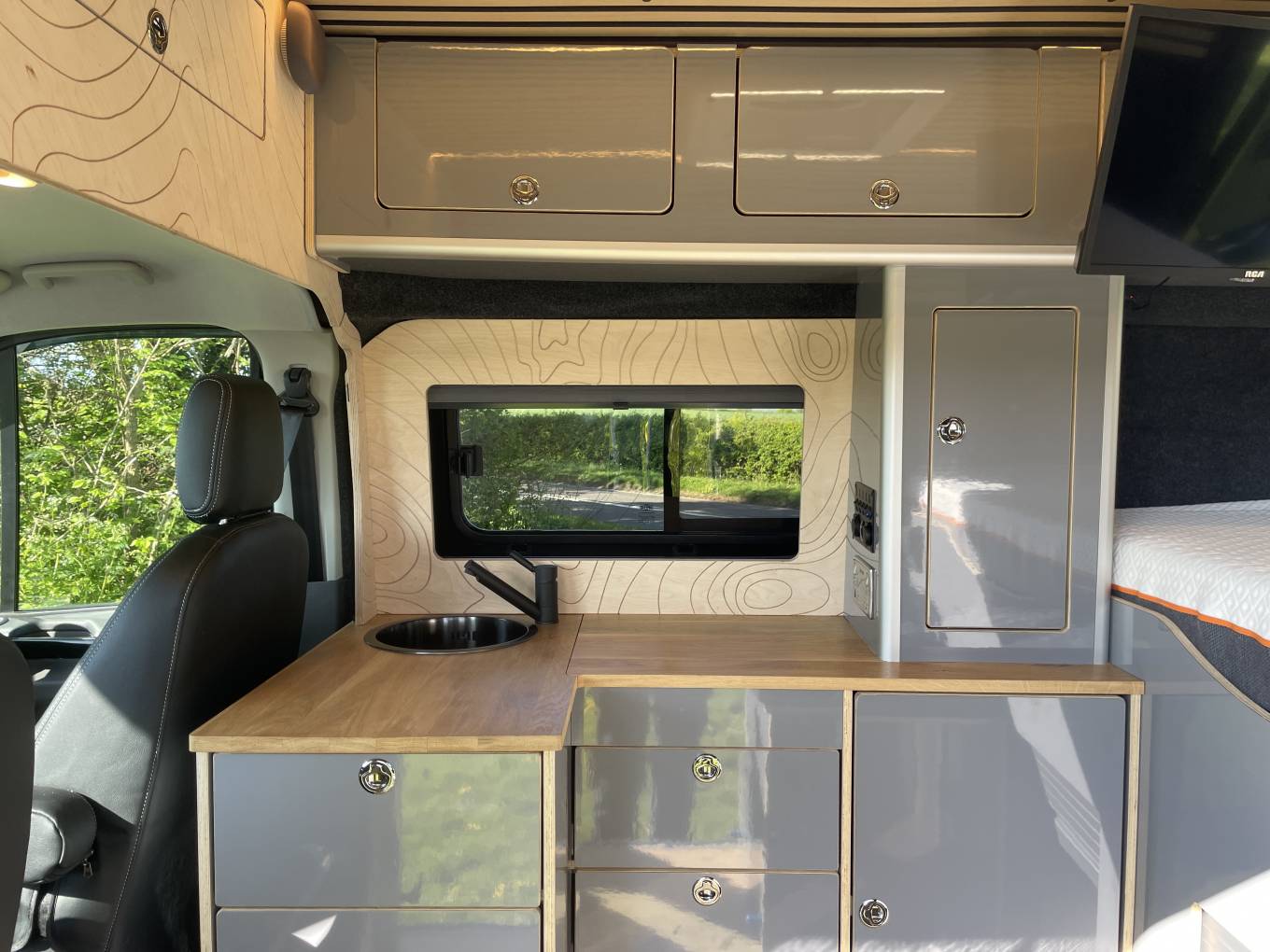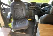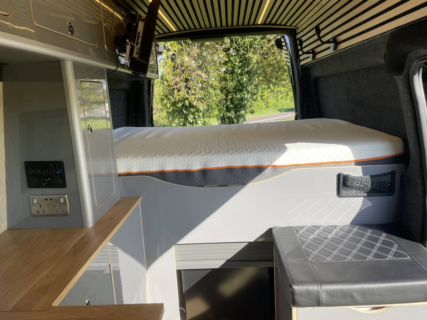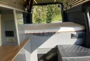 Inside it has front passenger captains seat, sink, plug in induction hob, compressor fridge freezer and a pull-out porta potti toilet. It has a large and generous double bed that is 1.7m x 1.2m.