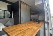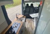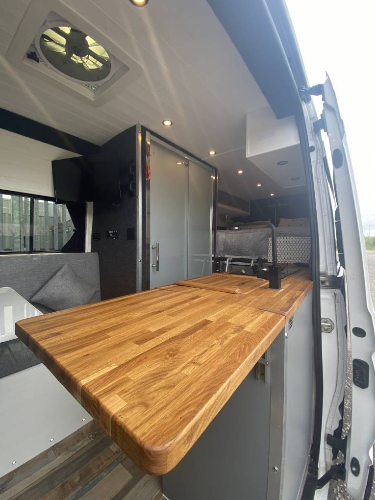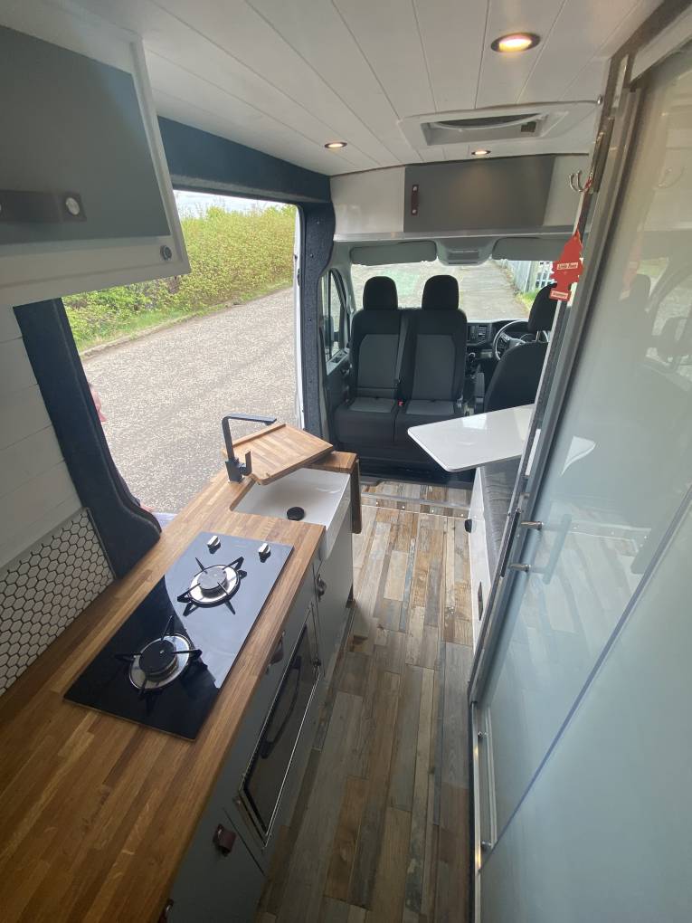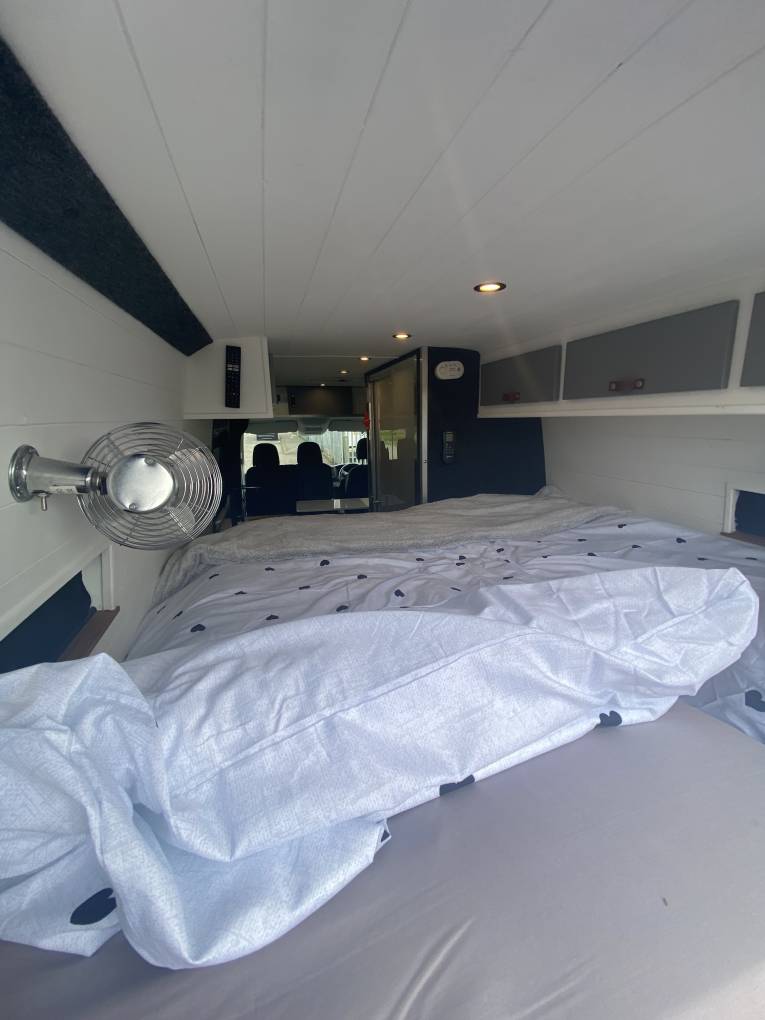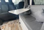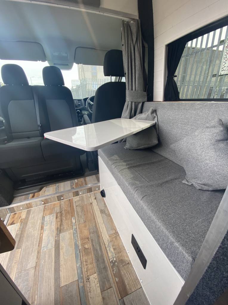 The double seats swivel round to make a cosy sitting area with a two seater sofa offers ample social and seating space if entertaining. The white table is portable and is situated on a swivel arm to allow easy maneuverability. There is three, three point seat belts for safety while travelling. Ample spotlighting, plug points and USB throughout this vehicle.