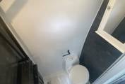 The colour scheme of the conversion is grey and white, with tasteful black and white ceramic kitchen tiles as splashback in the kitchen with the quaintest Belfast Sink! There is wooden effect flooring throughout..