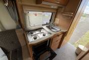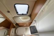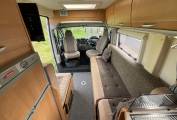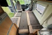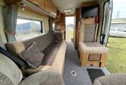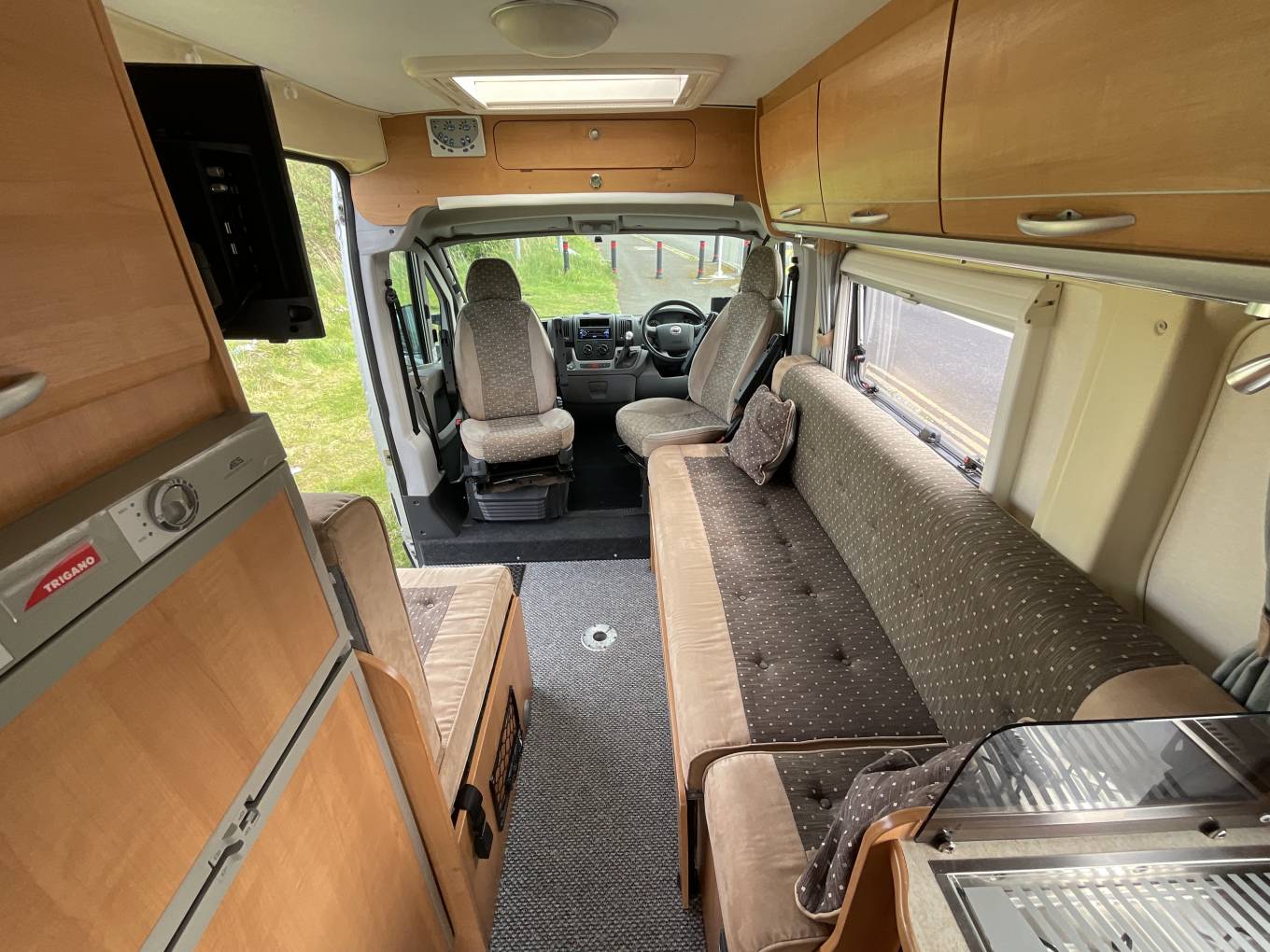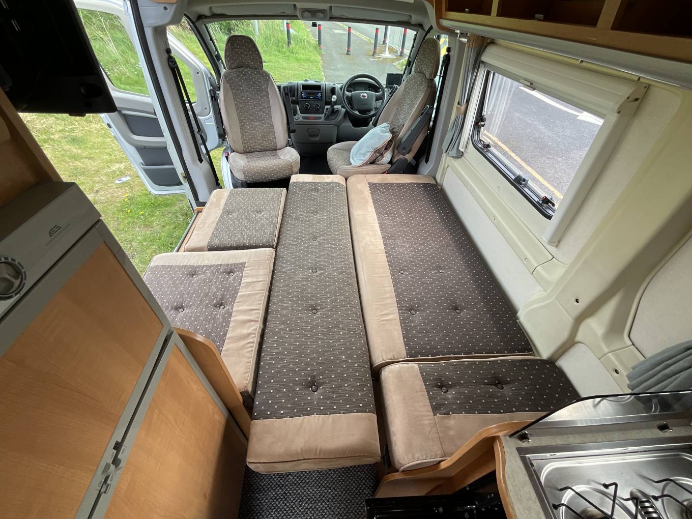 On entering via the side sliding door to your right is a single seat with three point seat belt, a long settee on the opposite side with two swiveling captain seats making up the lounge area.