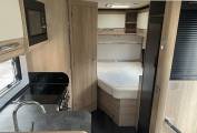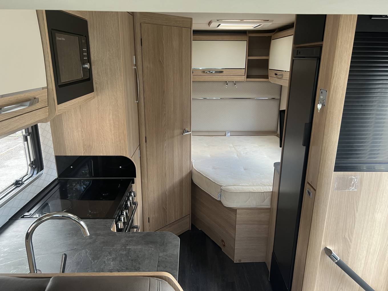 The rear fixed, French bed has additional storage below and surrounding, with a TV also in this area and just forward a large wardrobe, with hanging rail and then drawers.