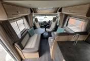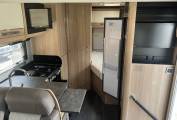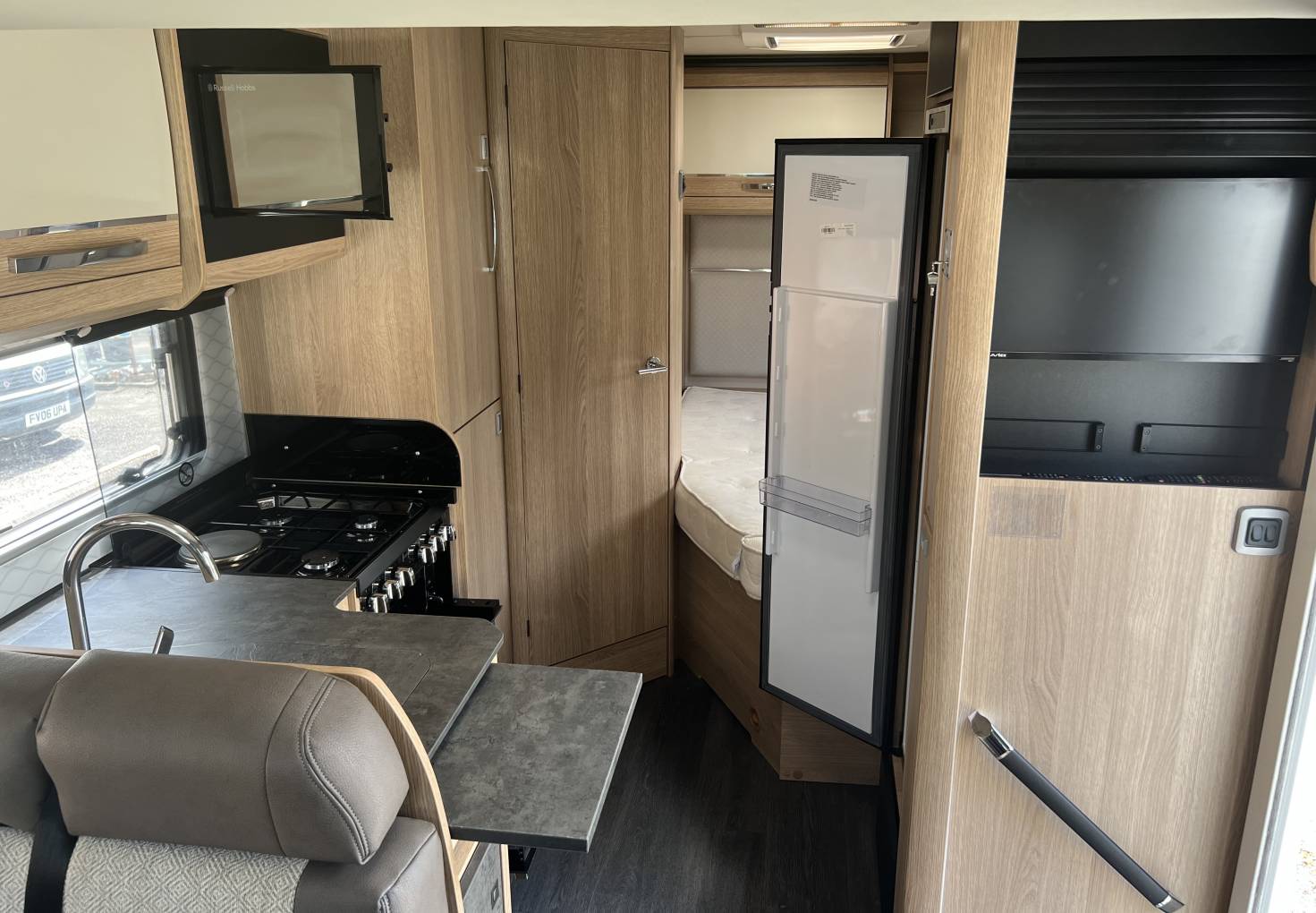 The kitchen covers both sides of the motorhome, with good amount of worktop space and includes cooker with oven, grill, 3 gas burners, 1 electric hob, plus sink and microwave. Opposite is the large fridge, with freezer and integrated coolbox.