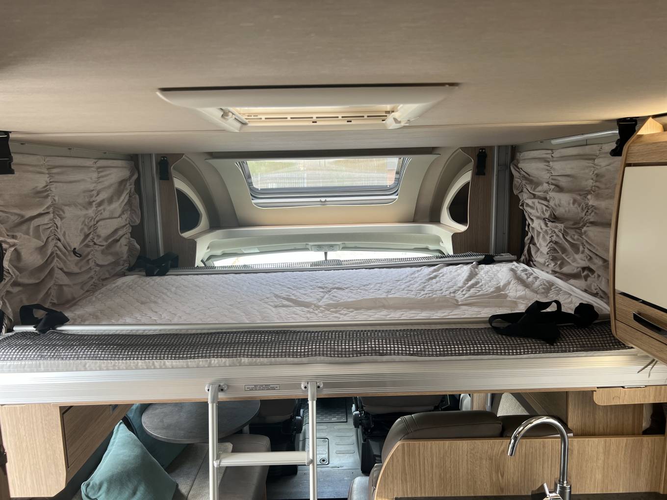 In the front lounge are 2 sofa, 1 of which is L shape and includes 2 travelling seatbelts and the other a small one behind the passenger seat, which create a nice area for entertaining. A large double bed is above and is electronically operated.
