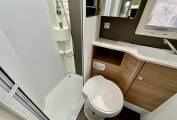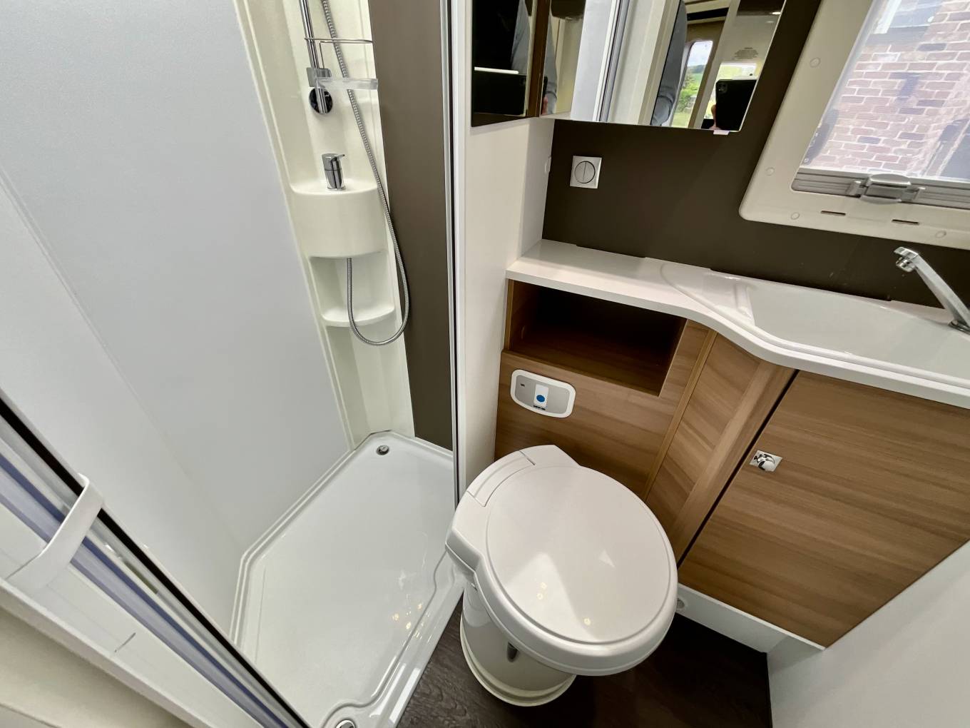 The washroom is spacious, equipped with Thetford toilet with cassette, shower with screens, washbasin and large vanity units.