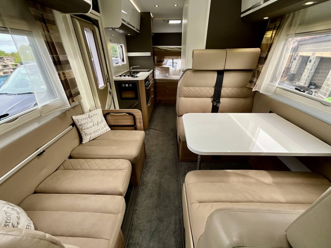 The kitchen is fully equipped with gas hobs, sink with hot and cold water, Thetford oven/grill, sizeable Thetford fridge with freezer, plenty of storage, extractor fan and kitchen lights.