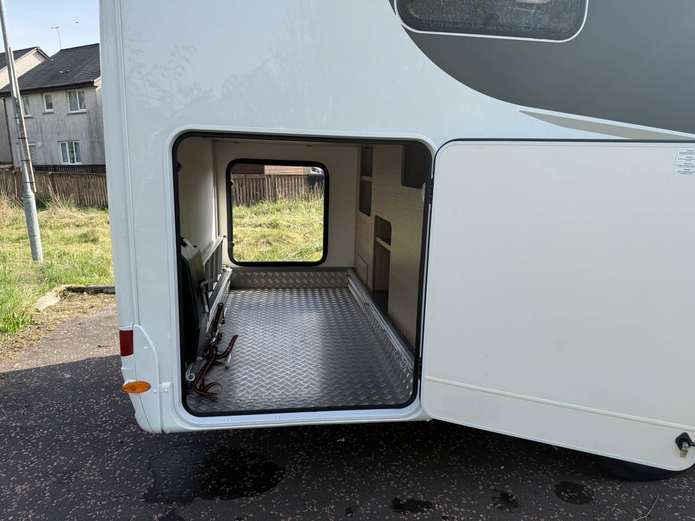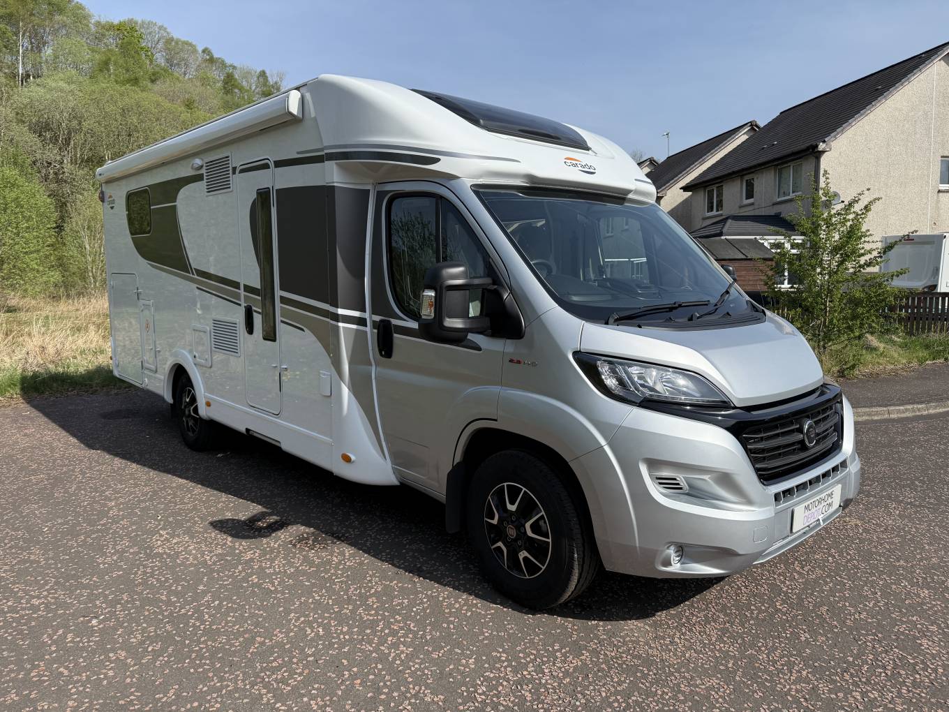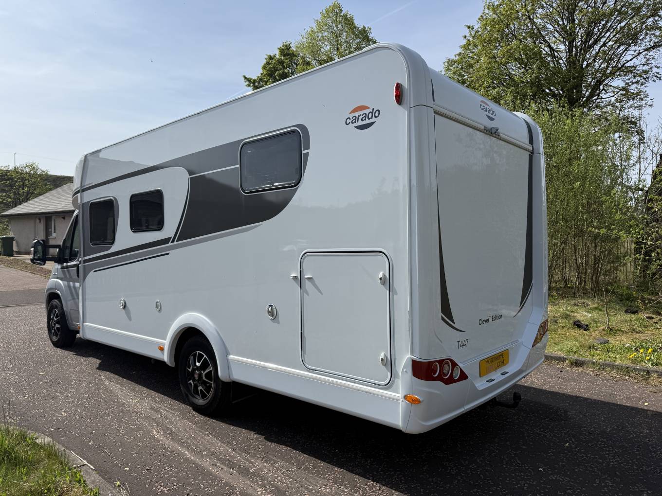 Motorhome Depot Glasgow proudly presents this spotless showroom condition Carado T447 motorhome with its sought after rear fixed bed configuration above a large sports garage which can be accessed externally by both sides of the motorhome and has room for moto, E-bikes, sports and all holiday adventuring equipment.