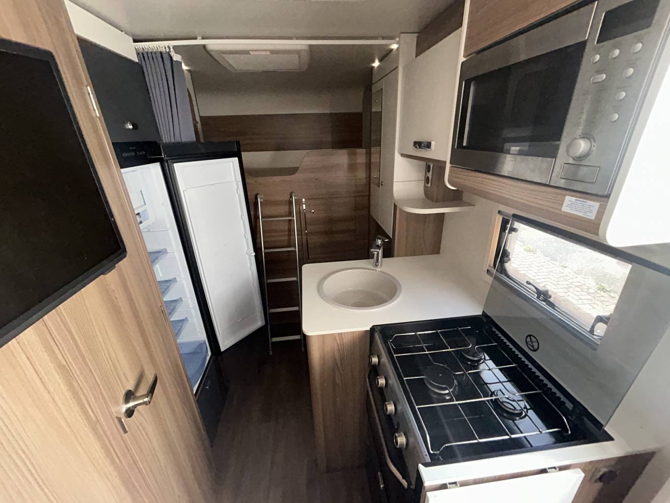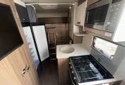 As mentioned the layout of the motorhome is perfect for anyone with a young family. At the front you have a spacious lounge area that is ideal for the family to sit around. This motorhome has two separate tables, a large table that can be used for meal times and a smaller coffee style table to give you more space. Moving back the 695 has an excellent kitchen which includes an oven, grill, hob with 3 gas burners, sink with mixer tap, large 3-way fridge with ice compartment and microwave oven.