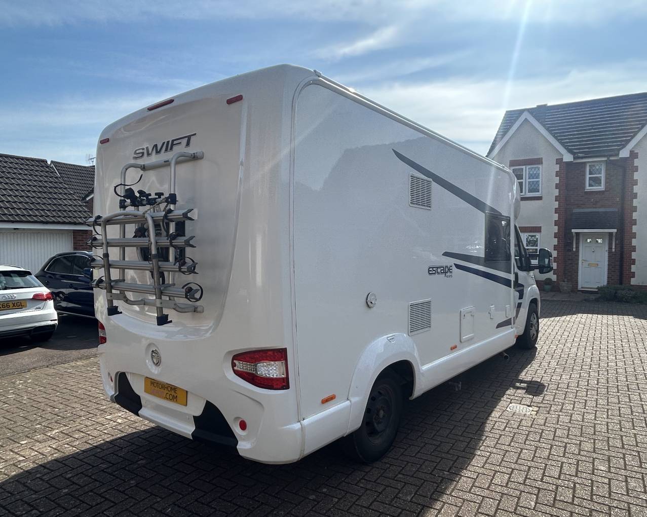 The layout of the 695 gives you the option of a having a good sized garage when traveling. The bottom bunk pushes up to give you plenty of space for your equipment which can then be taken out once your destination has been reached. This particular motorhome also has a bike rack for 4 bikes and the owners have a blow-up awning that is available to purchase separately.