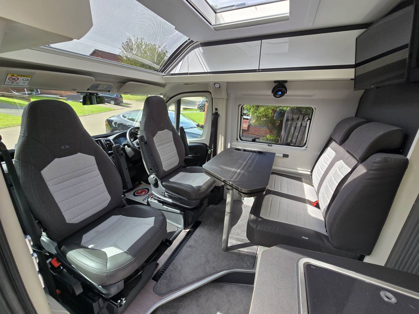 The front dinette is perfect for an evening watching Tv or enjoying a meal together with the drivers and passengers seats on swivel bases they can be turned around with ease for the extra two seating, meaning up to 4 people can sit comfortably. The TV is included.