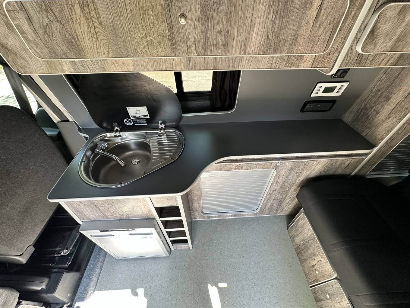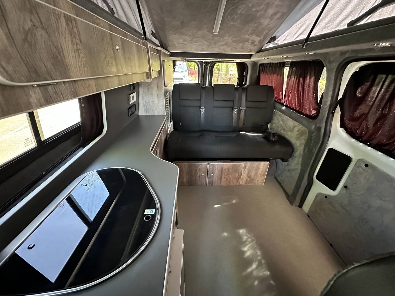Starting at the front of this campervan you have the double passenger captain seat which swivels to the rear giving you a great area for relaxing & socialising, with space around a central table that is easily removed and stored. The central dinette has a quality kitchen area with Dometic hob and sink, Liberty compressor fridge and plenty of storage space. As evening nears the rear travelling seats easily convert into a comfortable double rock “n” roll bed with storage underneath. You will find the second sleeping area in the pop top which has 3 large windows giving plenty of natural light. When this is not being used it pushes up to maximise space.