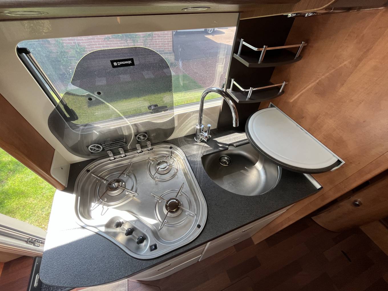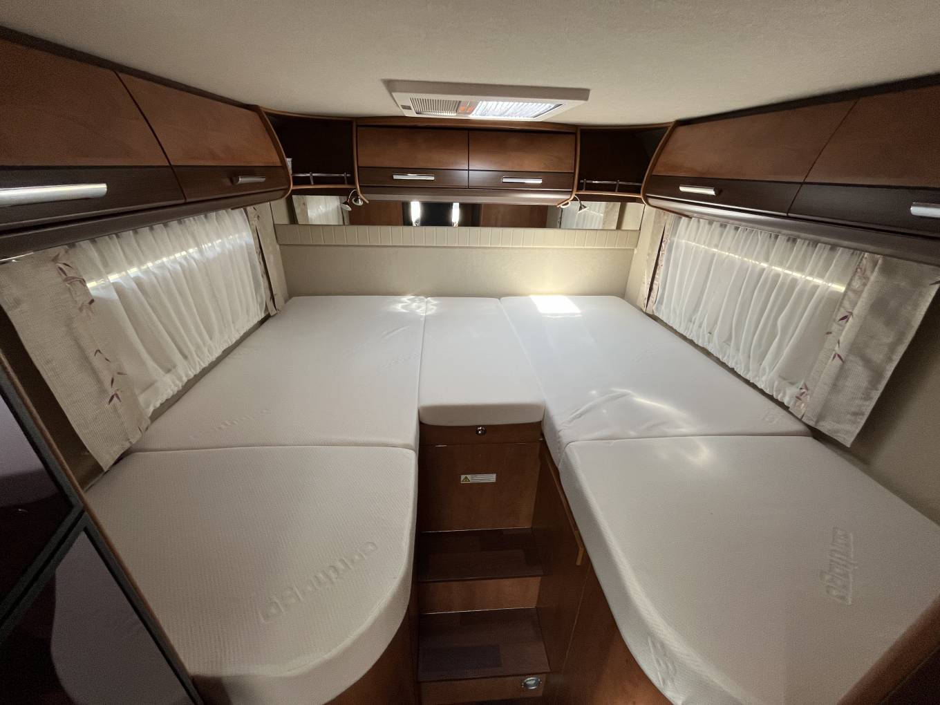In the kitchen, you’ll find a spacious fridge, a three-burner gas stove, and soft-close draws, perfect for preparing local delicacies. Step into the rear to find the jewel of this motorhome: the sleeping area. Two fixed single beds or converted large double bed, with orthopaedic mattresses and memory foam, promise rejuvenating sleep. Clever storage solutions surround you, while thick insulation and Carthago’s double floor keep temperatures perfect all year-round.