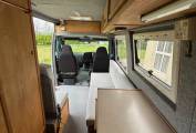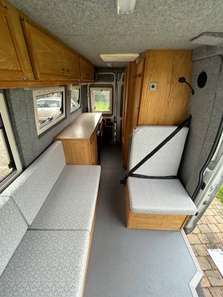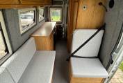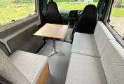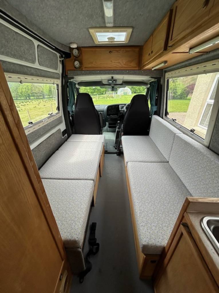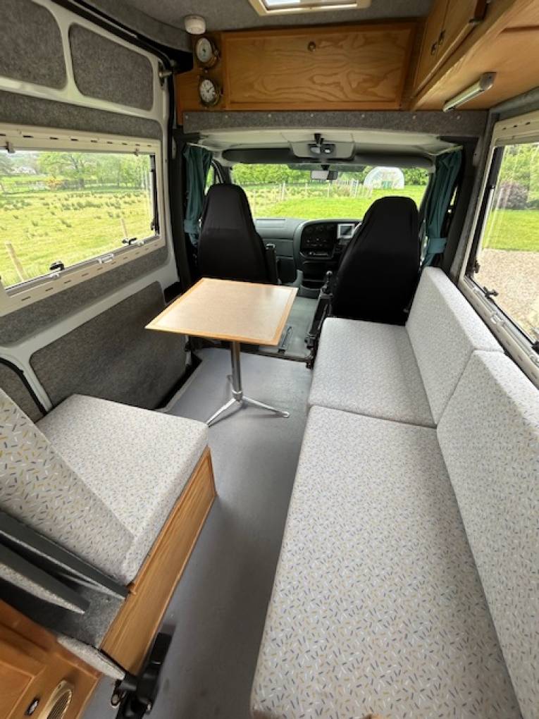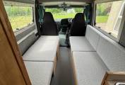 This van has one long sofa that acts as a single bed with a travelling seat that can be turned into another single.