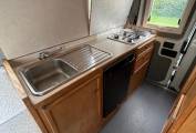 The galley kitchen faces the bathroom with lift up worktops covering the sink and 4 burner gas hob. The kitchen also includes an electric fridge, a microwave and ample storage room for utensils and food.