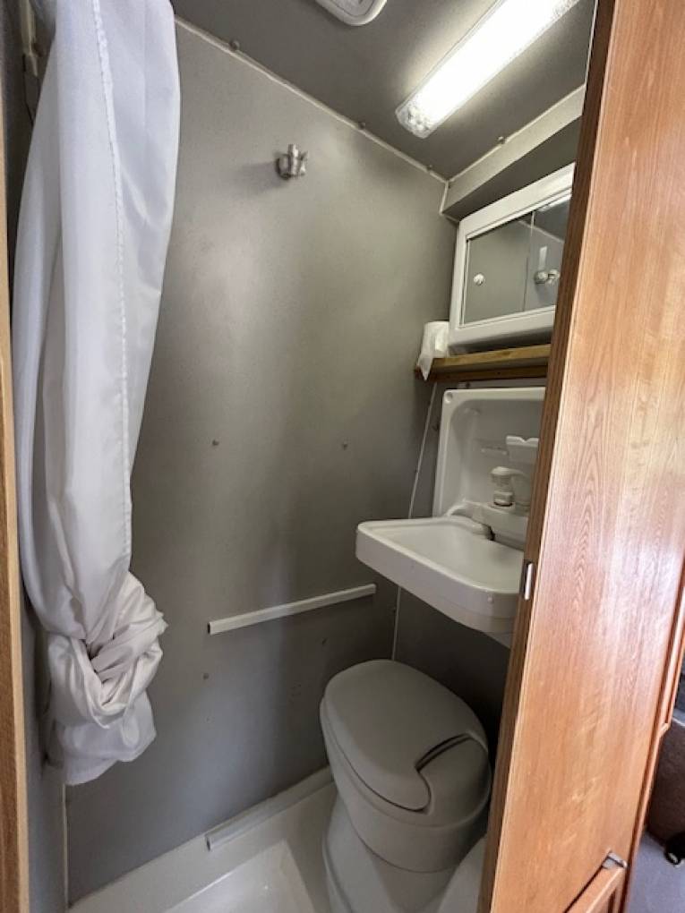 At the rear of the van there is a bathroom consisting of a shower with curtain, a toilet, a drop down sink basin and a mirror including storage behind it.