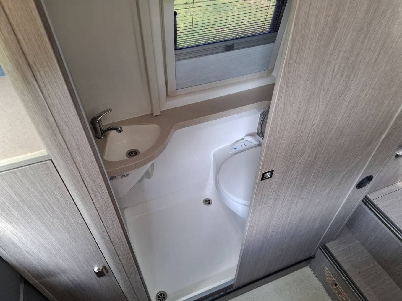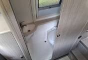 Behind the forward seating is the offside washroom which contains a toilet, sink and a shower.