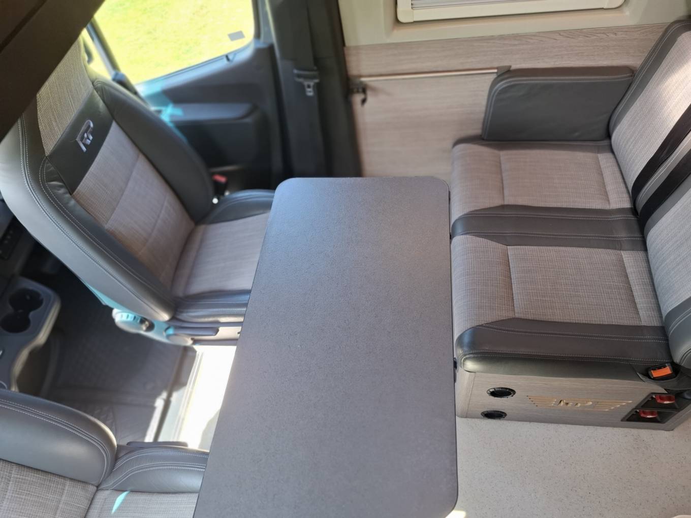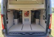 The cab benefits from an auxiliary remote controlled diesel heater (principally for the engine in cold alpine climates). The partial leather cab seats can be swiveled, and, used with the removable small table that fronts the integrated forward-facing habitation bench seat (with two additional seat belts), create a dedicated dining/leisure area. This area can also be converted into a single berth suitable for children or young adults.