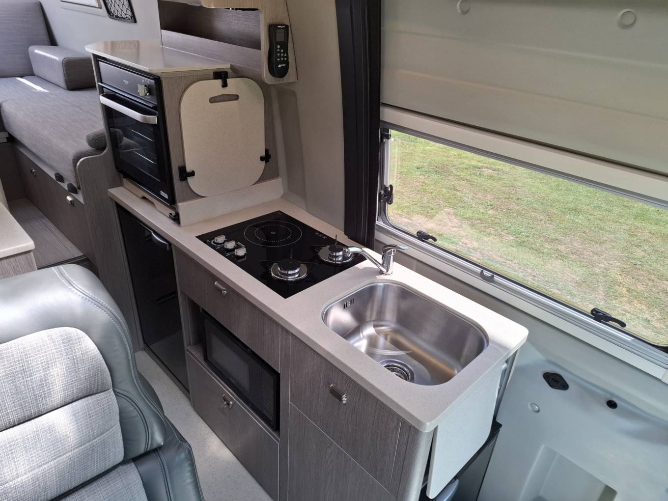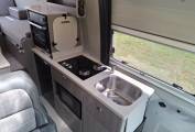 On the nearside, behind the side door is the kitchen with a sink, cleverly designed extendable work surfaces, a hob with 2 gas burners and 1 induction plate, a microwave, a combination oven grill, a Vitrifrigo fridge with a freezer box, and a separate Vitrifigo freezer by the side door that can also be used as a second fridge.