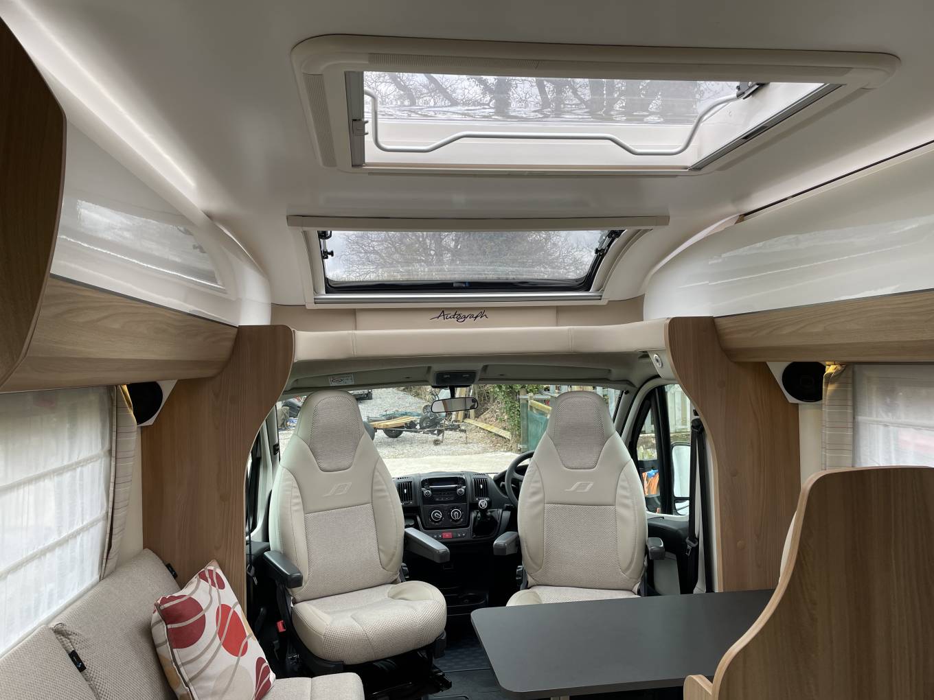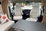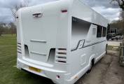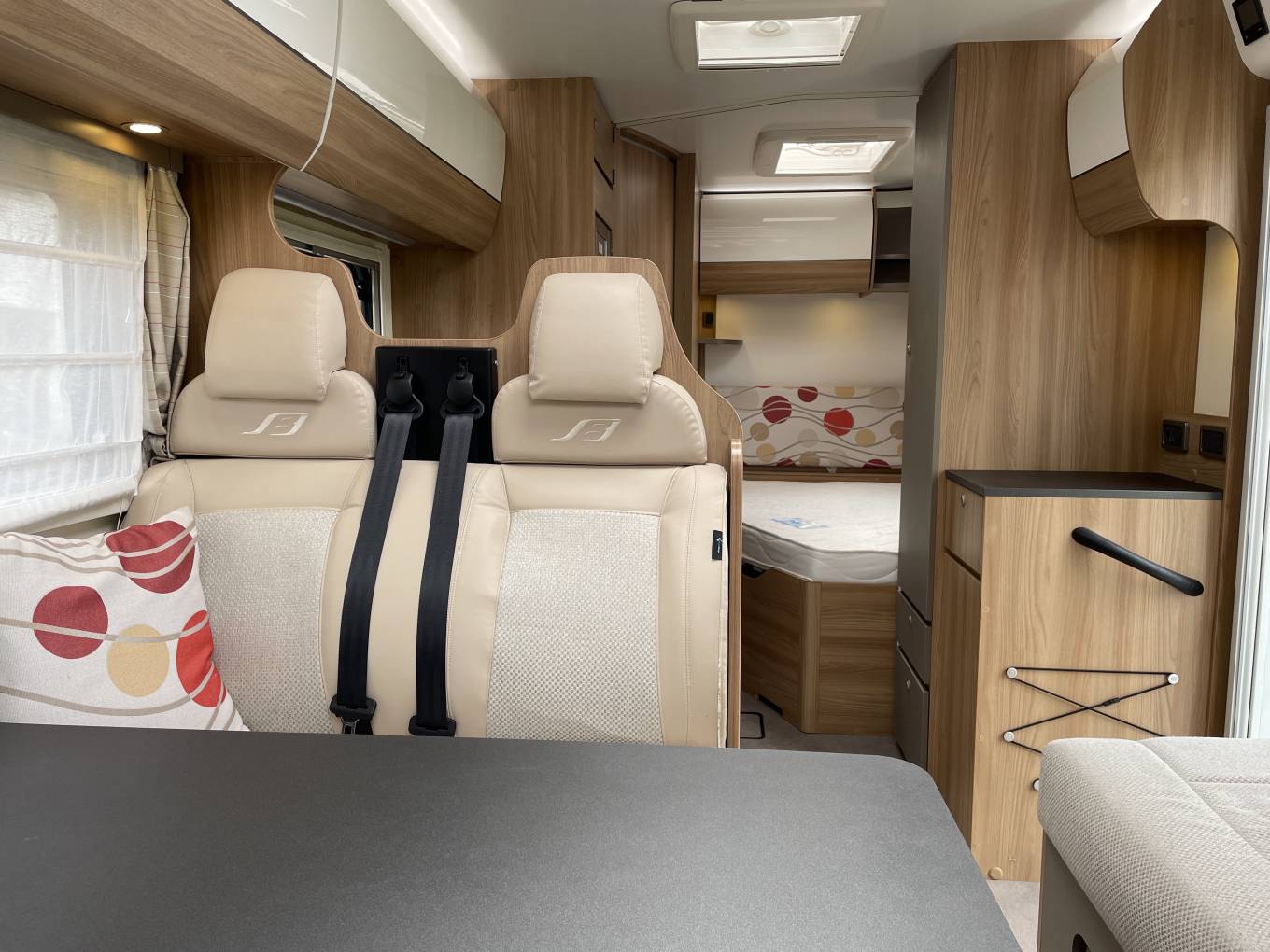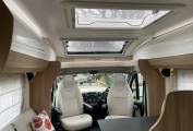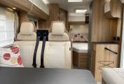 The front cab passenger and drivers seats both easily swivel round to face the living space, offering additional seating for either relaxing or entertaining. The generous corner washroom has a walk-in shower cubicle with a shower screen divider, washbasin with a chrome mixer tap, a Thetford cassette swivelling toilet, a cabinet, mirror, radiator panel and a handy retractable clothes line. Next to here is a generous sized French double fixed bed with a DreamSleep mattress, panoramic side window, overhead reading lights and great underneath bed storage, with easy access from either inside or outside the motorhome. The Alde 3020 heating/hot water system ensures piping hot water and a lovely warm living space. The cab includes, a large overhead skylight with blinds, steering wheel with multi-function controls, Remis concertina blinds, radio, electric driver and passenger windows, electrically adjustable wing mirrors, driver and passenger airbags and remote central locking, cab air conditioning, cruise control and reversing camera. This superb motorhome has a maximum vehicle weight of 3500Kg, which allows anybody to drive the motorhome on a full standard UK driving licence and comes with two sets of keys. The external length is 7.51m.