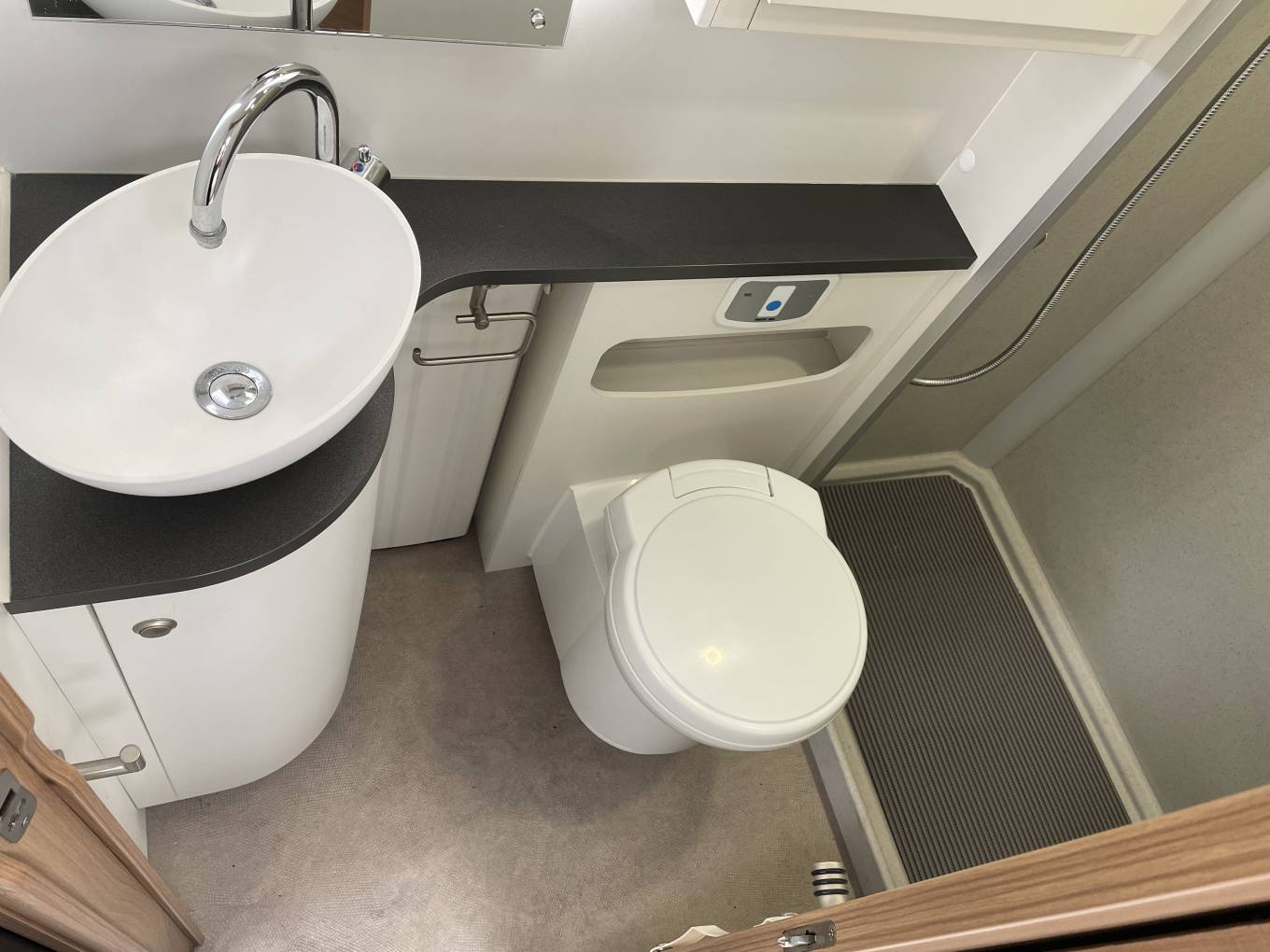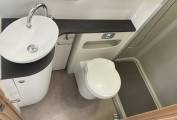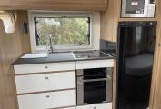 The lounge and dinette area is very bright and open with twin Captains seats, a large side sofa and a forward facing twin seat giving seating for six in comfort. There is a good-sized freestanding dining table that stores away, and you have good storage space under the sofa and further storage available above the cab area and from a range of overhead lockers. At night-time the seating area can be easily made up into an additional DreamSleep There is a well-equipped kitchen area, with a sink and mixer tap, a three gas burner hob along with an electric hotplate and a Thetford combination grill and oven, there is also a microwave and a large 3-way powered Dometic tower fridge with integral freezer. There are good-sized storage cabinets throughout and soft close drawers.