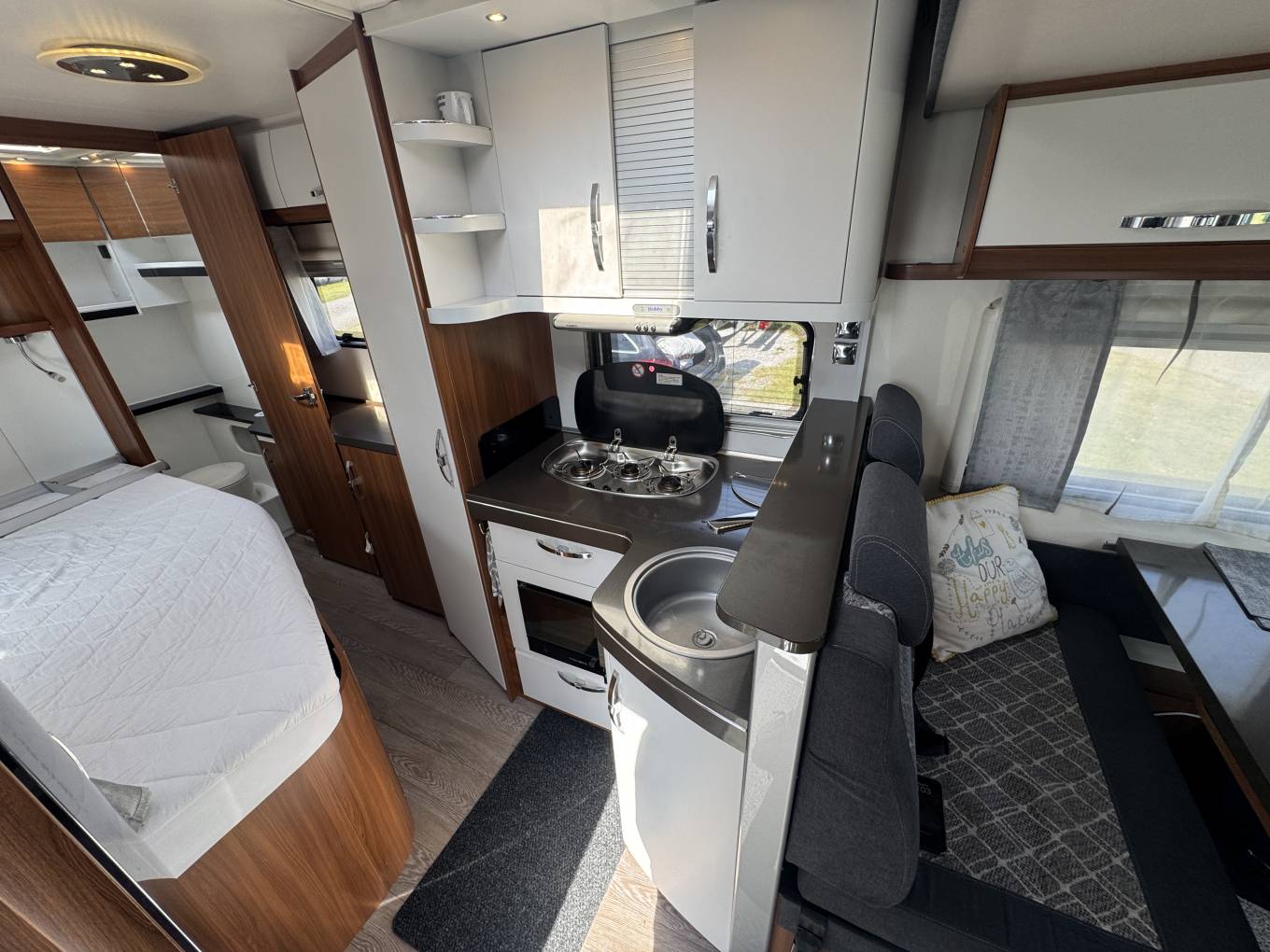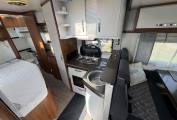The fully fitted kitchen includes a 3-ring gas hob, a Dometic oven/grill, stainless steel sink, and a full length Dometic fridge freezer, offering all the amenities needed for self sufficient travel.