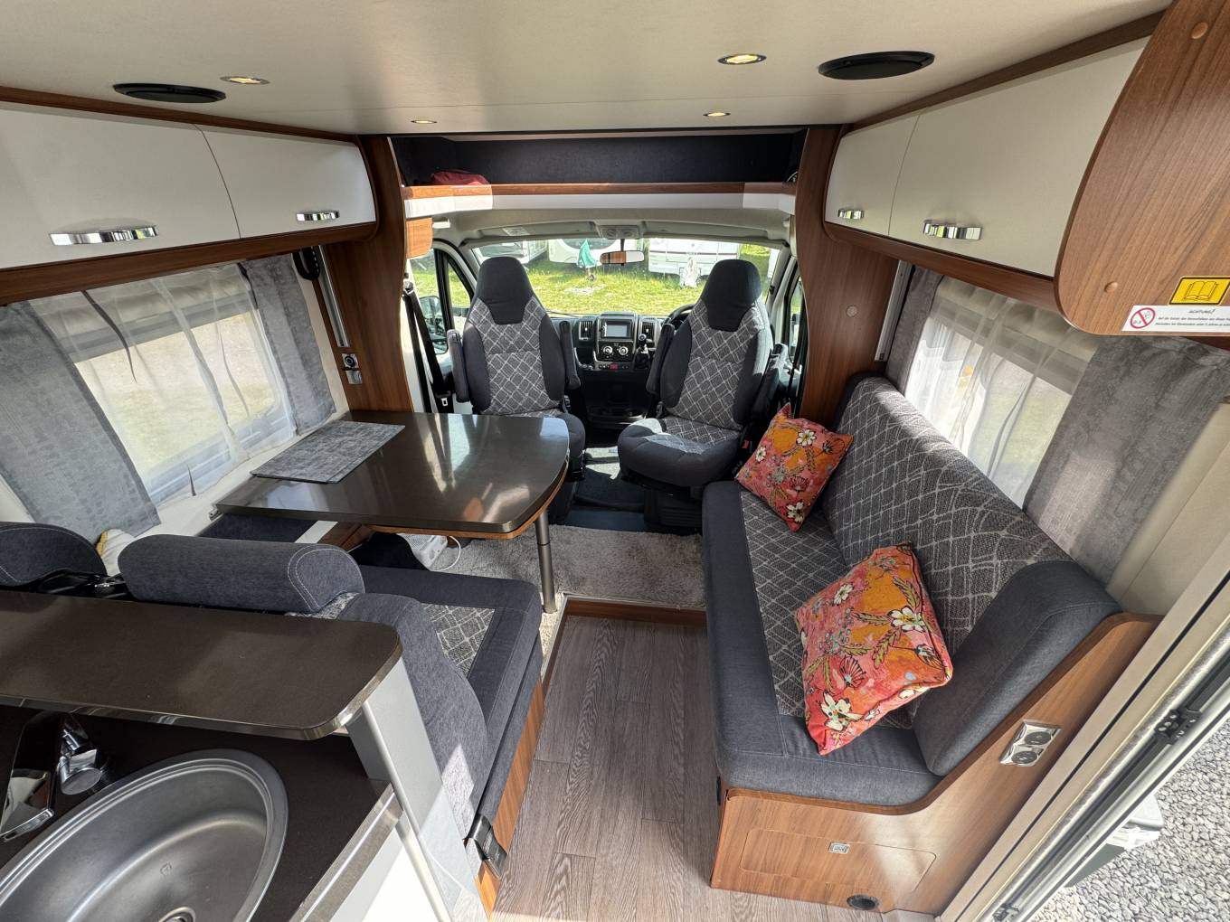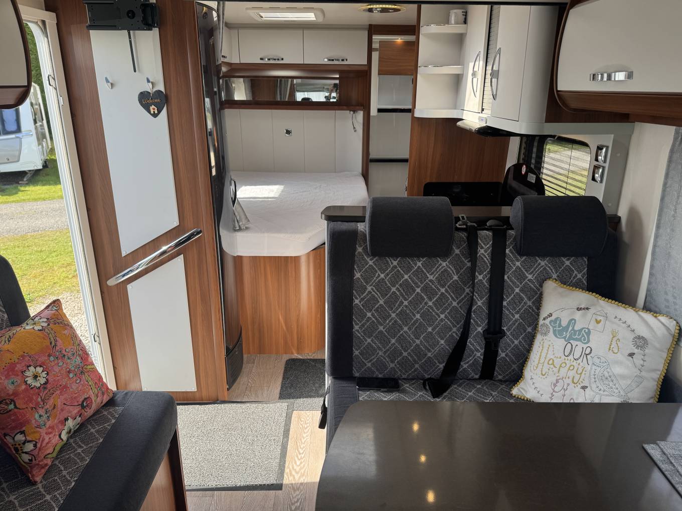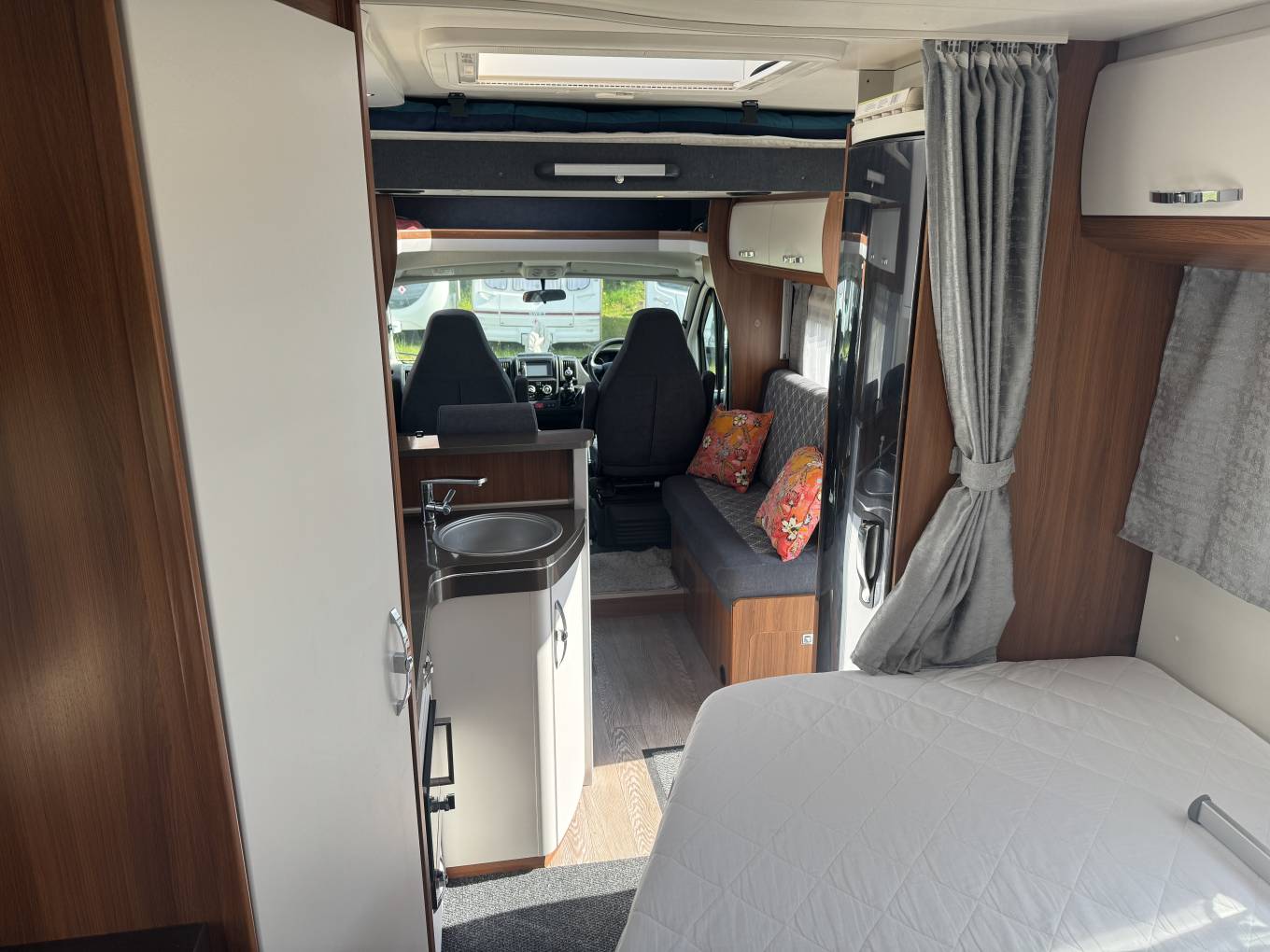 This well-maintained 4 berth 4 travel seat model offers a thoughtfully designed layout featuring a large rear washroom, fixed French bed, a spacious drop-down double bed above the cab, and a generous dinette area perfect for relaxing or entertaining. The open-plan design ensures a light and airy feel throughout, ideal for both short breaks and extended touring.