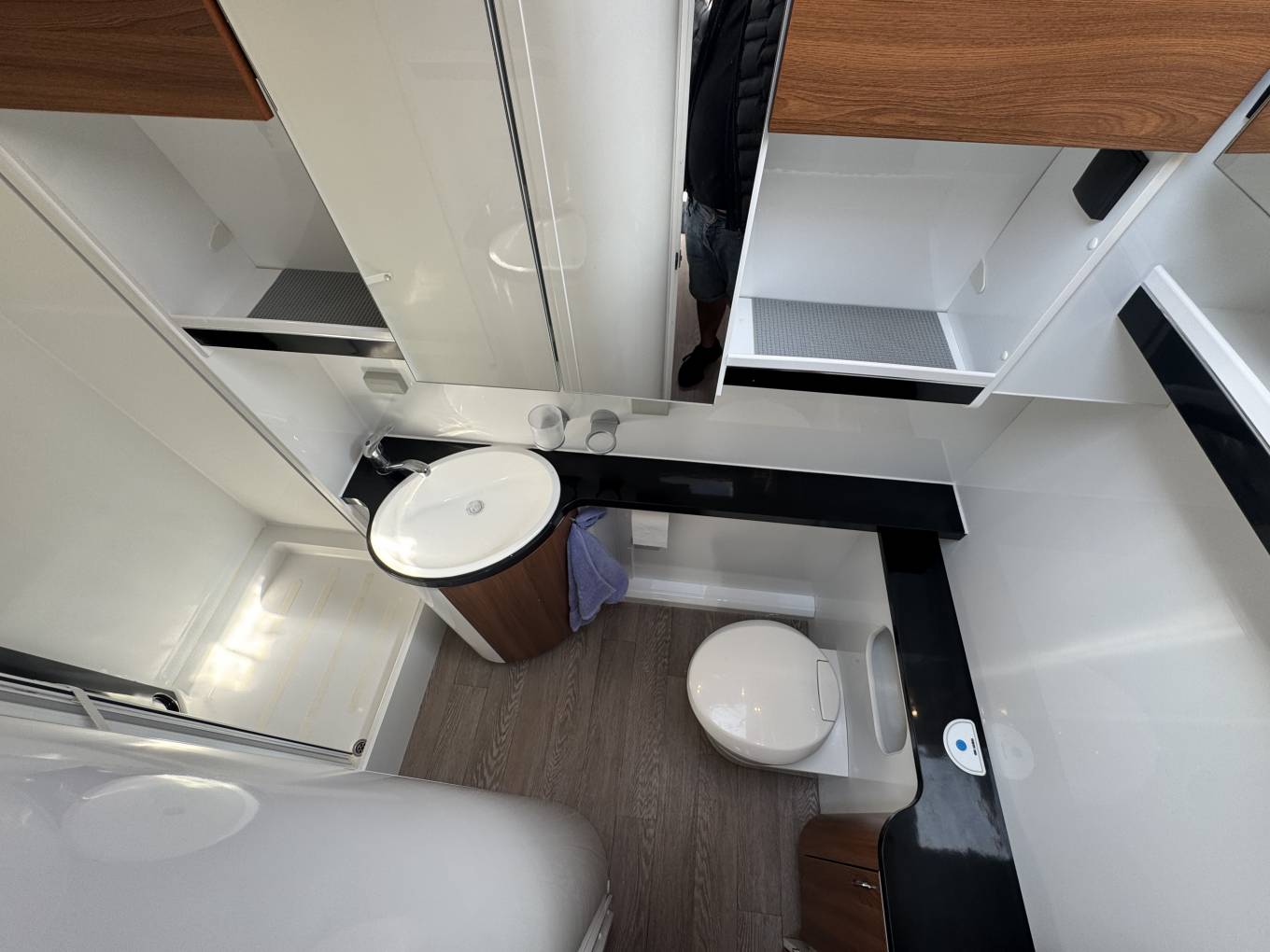 Starting at the rear of the motorhome, there is the large bathroom which includes a full length separate shower, wash basin, Thetford toilet along with storage cupboards and a good sized mirror. Just in front of the washroom is the wonderfully presented fixed French Bed along a small dresser table, mirror and storage underneath and in the overhead lockers. There is also an additional Truma heating/hot water control which is great for heating the motorhome on those cold and frosty mornings without the need to get out of bed.