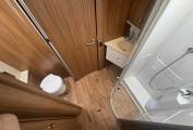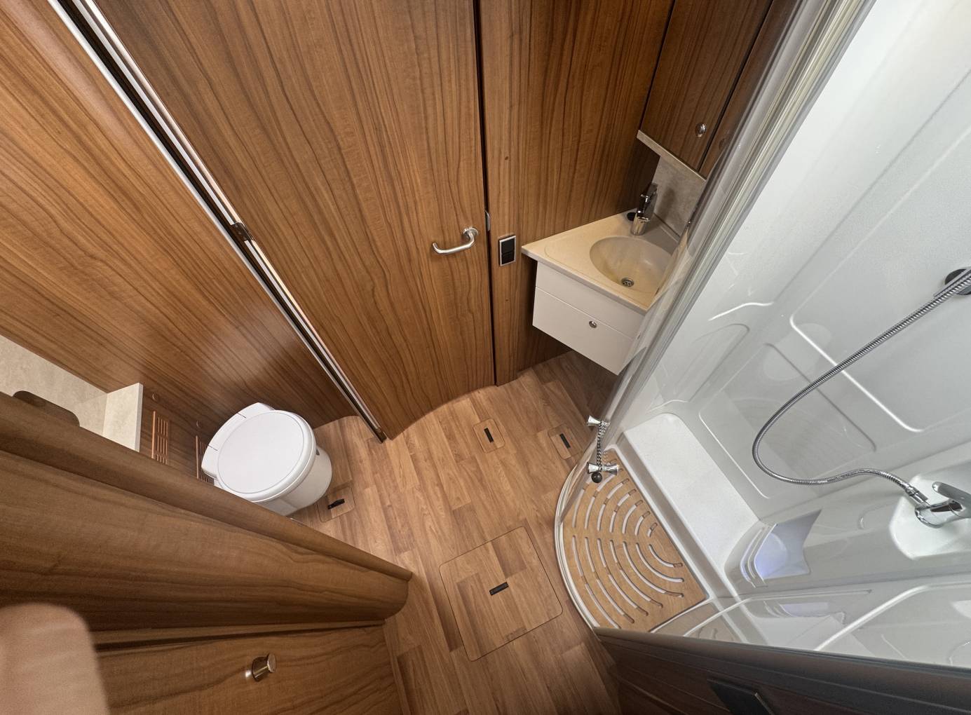 Moving through to the centre of the motorhome, there is a large washroom which includes a shower, wash basin with mixer tap, cupboards and a separate Thetford toilet with further storage units. This area can be closed off from both the bedroom and living area.